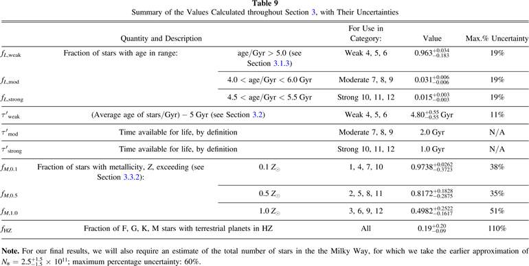 It is therefore of foremost importance to estimate the fraction, fL, of all stars currently within the Milky Way that are older than 5 Gyr. For this value, we take the estimate from Dalrymple (2001) to one significant figure since, as we shall see in Section 3.1.4, our estimated fraction is relatively insensitive to adjustments to this parameter. As we show, the results do not change significantly if we relax this criterion and allow life to form after, e.g., a few Gyr, given that the SFR has steadily declined throughout the Galaxy's lifetime.