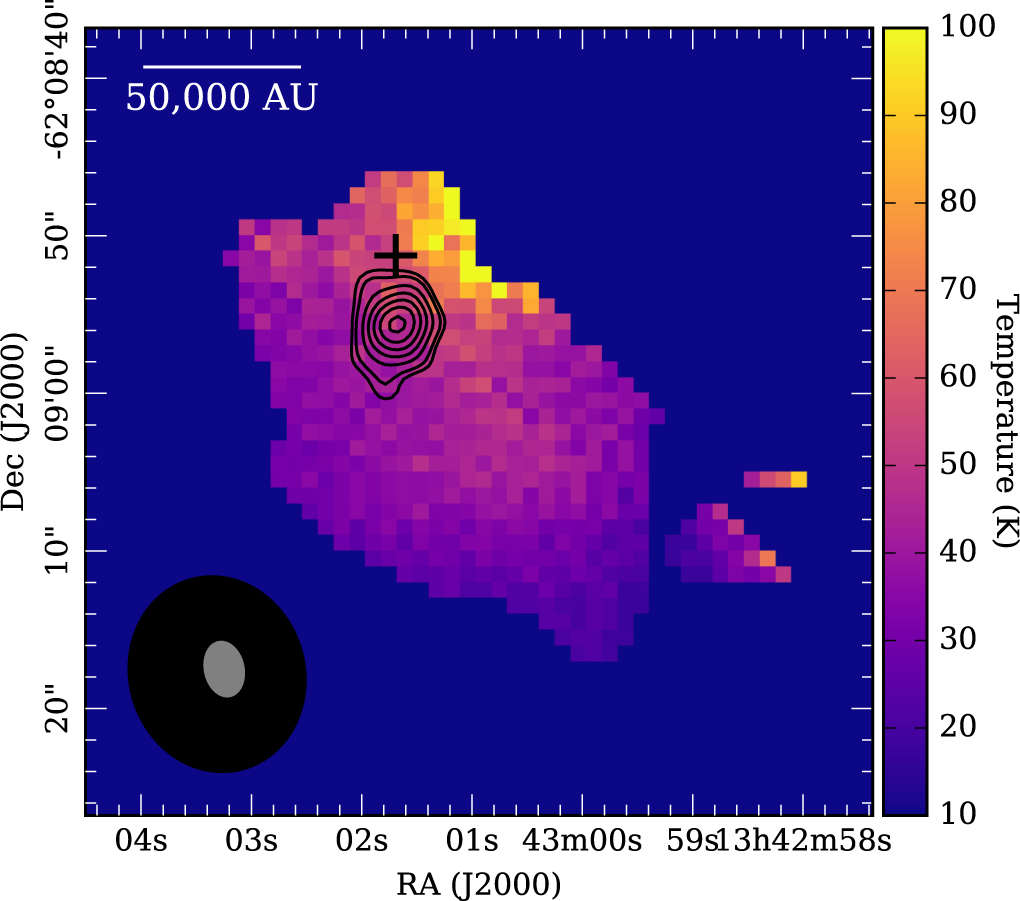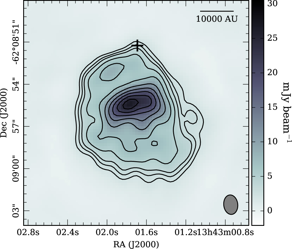 The infrared source associated with AFGL 4176 lies at the northern edge of a compact H ii region (Caswell et al. 1992; Ellingsen et al. 2005; Shabala et al. 2006) and is associated with a group of 6.7 GHz Class II methanol masers (Phillips et al. 1998). It has been previously observed at 1.2 mm with the Swedish-ESO Submillimetre Telescope (SEST) by Beltrán et al. (2006), who found a dense core of 0.8 pc and 890 M⊙ at a distance of 4.2 kpc. In addition, we presented initial results from ATCA NH3 observations that indicated that AFGL 4176 may be embedded in a large-scale rotating toroid with a radius of ∼0.7 pc (Johnston et al. 2014). de Buizer et al. (2009) detected shocked H2 emission surrounding AFGL 4176, possibly from knots in an outflow, and Ilee et al. (2013) observed 2.3 μm CO bandhead emission toward AFGL 4176 that could be tracing the inner ∼10 au of a Keplerian disk. Modeling of the spectral energy distribution (SED) and mid-IR interferometric observations was carried out by Boley et al. (2012, 2013), who found that a combination of a disk-like structure with a radius of 660 au (inclination of 60°, PA = 112°), as well as a spherically symmetric Gaussian halo with an FWHM of ∼600 au, was able to explain the observations.