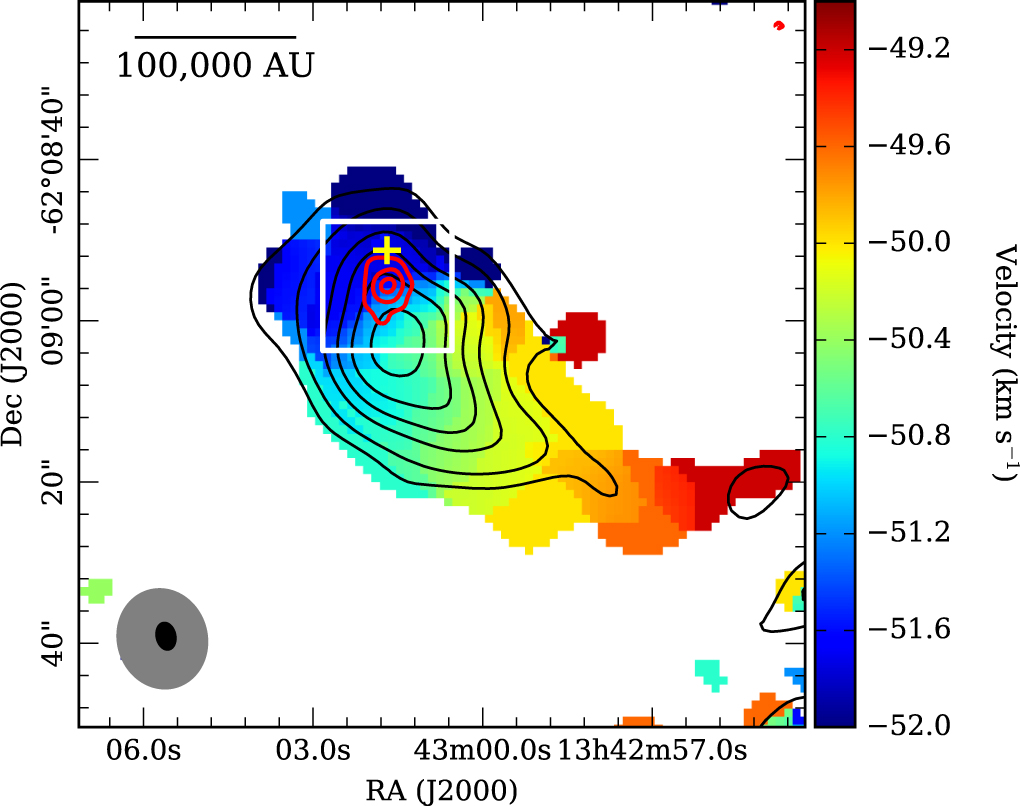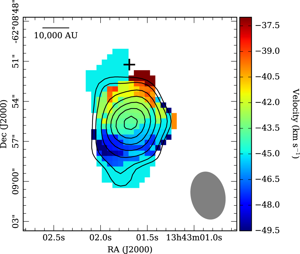 30 PA = −31.1°, respectively. The H29α image had an rms noise of 1.3 mJy beam−1 in a channel width of 2.0 km s−1 (larger than the native spectral resolution of 0.33 km s−1), and the C34S had an rms noise of 4 mJy beam−1 in a channel width of 1.4 km s−1. The ALMA and APEX C34S images were combined using the CASA task feather.