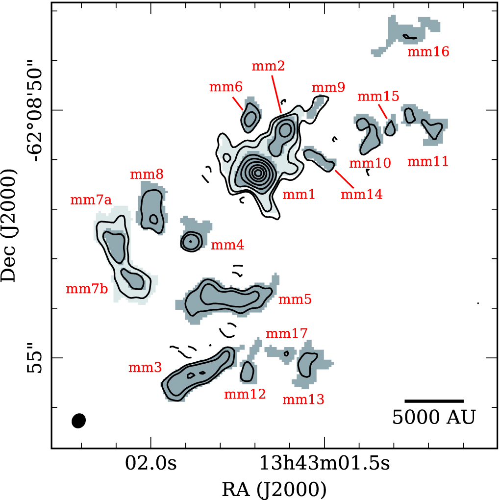 Figure 1. Continuum emission toward AFGL 4176 at 1.21 mm observed with ALMA shown in contours (non-primary-beam corrected, σ = 78 μJy beam−1 × −5, 5, 10, 25, 50, 100, 200, 300, 400). The area of each detected ALMA 1.21 mm source is shown in dark gray, as well as combined sources mm1 branch (containing mm1 and mm2) and mm7 in light gray (see Section 3.1.1 for details). The 1.21 mm sources, which are listed in Table 4, are labeled in red. The synthesized beam, with size 0.28 × 0