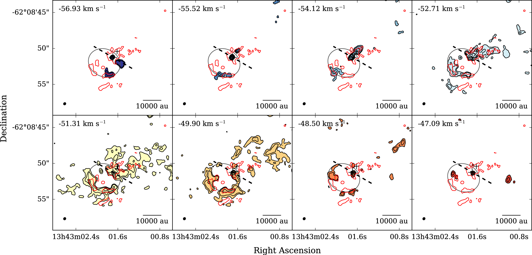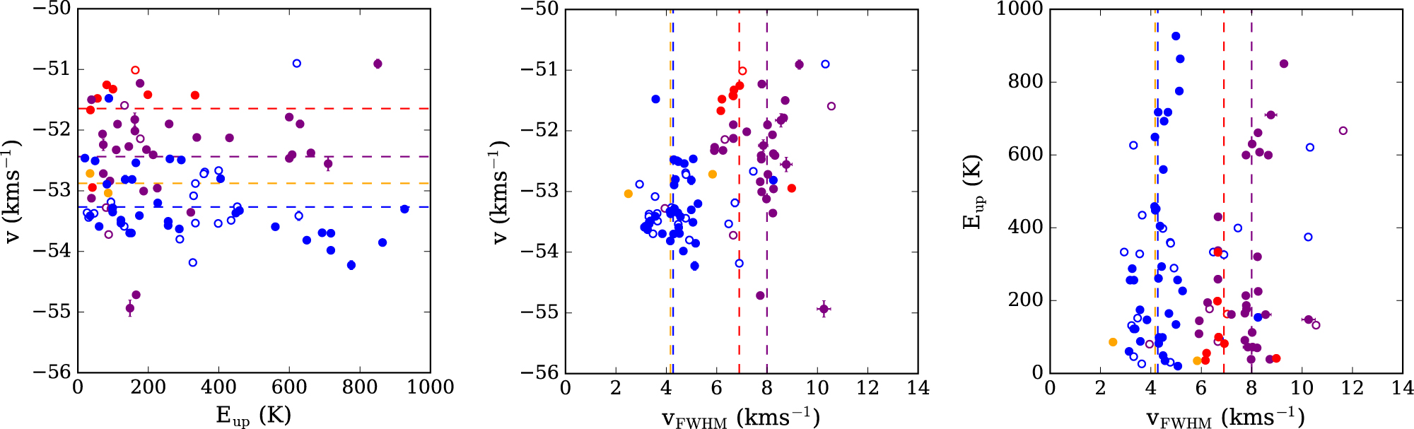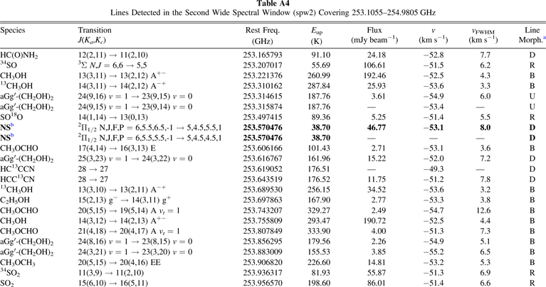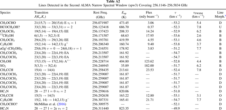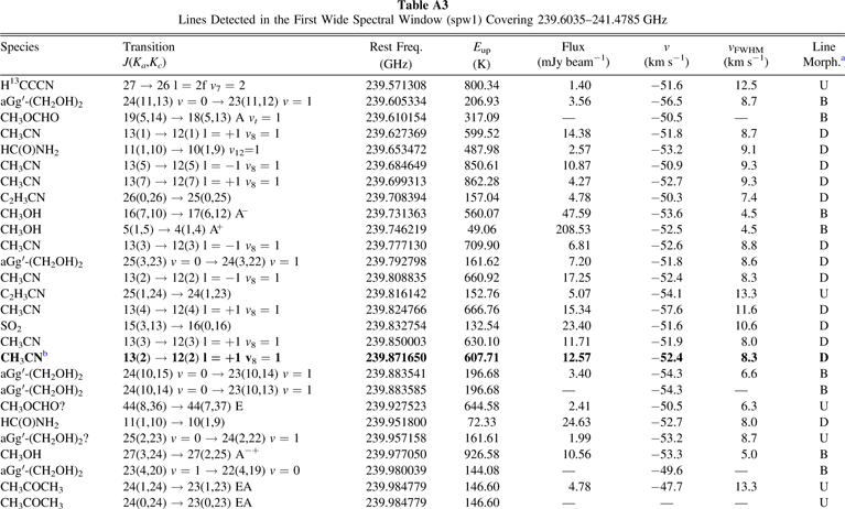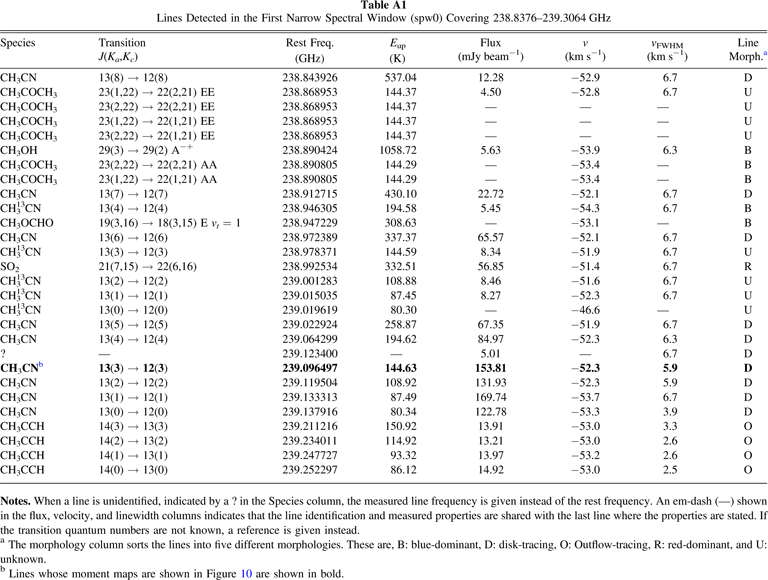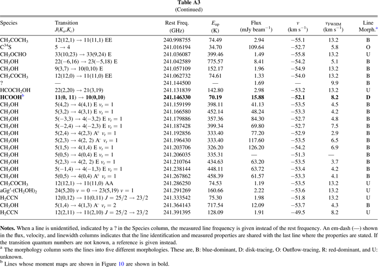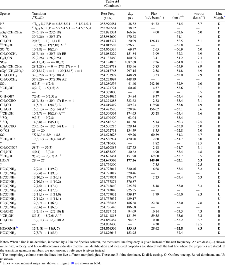 aThe morphology column sorts the lines into five different morphologies. These are, B: blue-dominant, D: disk-tracing, O: Outflow-tracing, R: red-dominant, and U: unknown. bLines whose moment maps are shown in Figure 10 are shown in bold.Table A5. Line Databases Used for Line Identification and Summary of Identified Lines