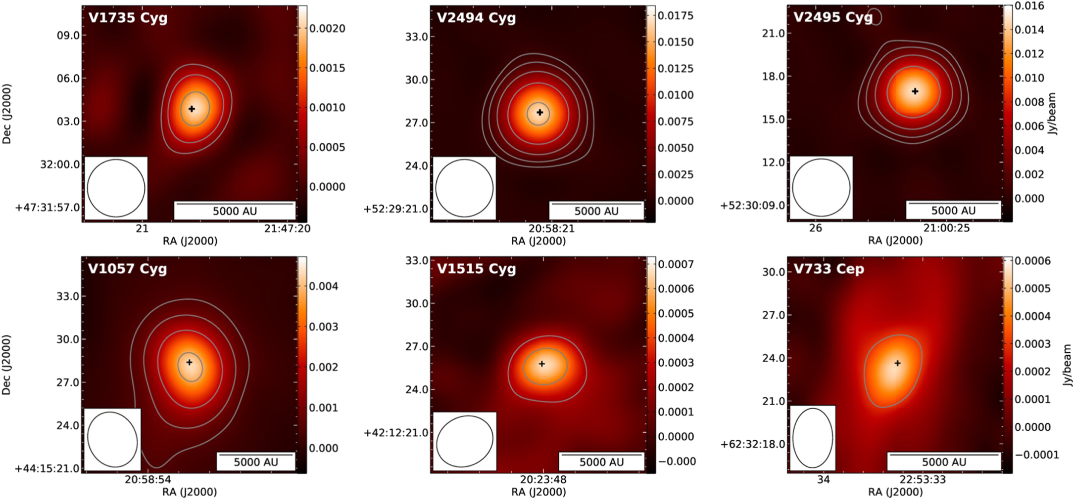 Figure 1 shows the continuum maps of all six targets. While flux densities did vary somewhat, intensity distributions remained unchanged, thus we only show one epoch. The maps of V1735 Cyg, V2494 Cyg, and V2495 Cyg were made using a restricted uv coverage, whereas the rest were not. We note that despite steps taken to mitigate the differing uv coverages, a portion of the variability reported may still be due to remaining differences.