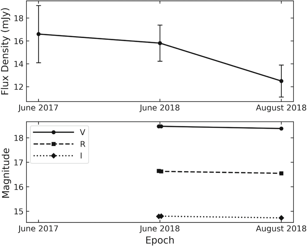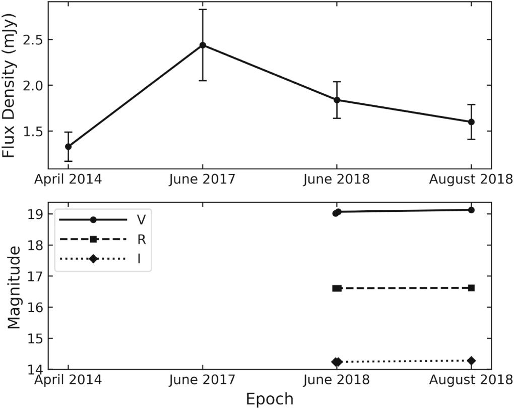 Standard image High-resolution imageFigure 3. Top: V2494 Cyg millimeter continuum flux density vs. time. Error bars are the uncertainties and are listed in Table 3. Bottom: V2494 Cyg VRI magnitudes vs. time. Error bars are roughly the size of the points.