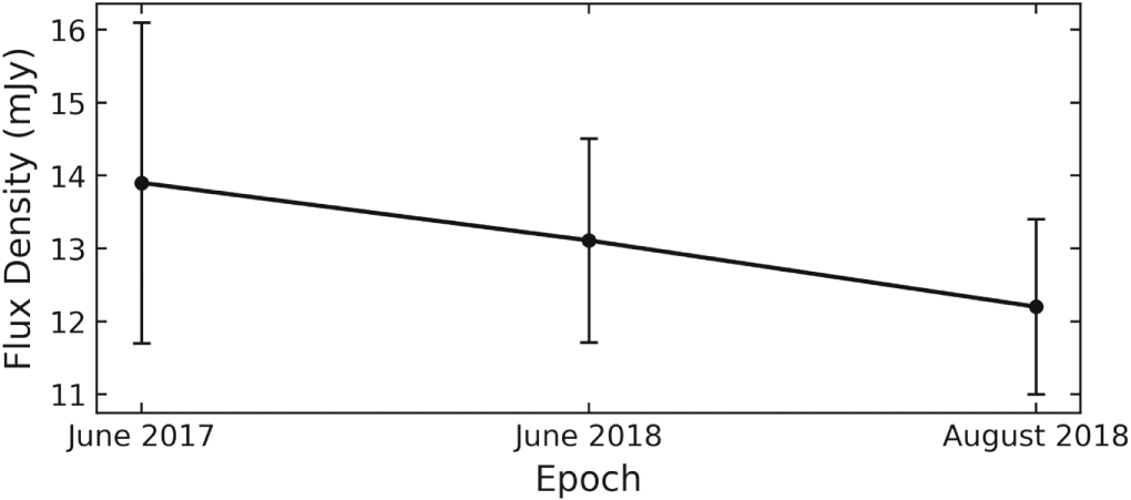 66 circular region, twice the convolved beam area. These results can be found in Table 3. To account for the frequency discrepancy, we adjusted our 2014 and 2017 measured flux densities using a spectral index of 2.5. The uncertainties stated in Table 3 were obtained via the root sum square of the 10% absolute flux calibration uncertainty of NOEMA (15% in the case of 2017 June observations) and the Gaussian fit uncertainties (typically 1%–5%).
