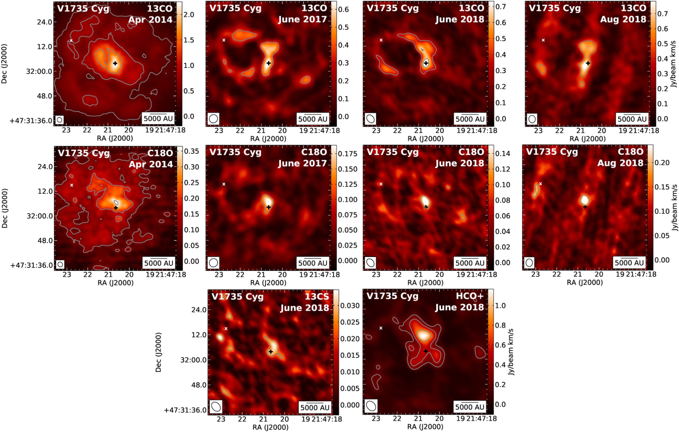 Figure 6. Moment-0 molecular line maps of V1735 Cyg. Top: 13CO. Middle: C18O. Bottom: 13CS (left) and HCO+ (right). Solid (dashed) gray contours denote positive (negative) 3, 6, 12, 24, 48, 96, and 192σ levels. σ for each epoch is equivalent to the rms of each image, which can be found in Table 4. The central "+" denotes the target's location (see Table 1). The "×" denotes the location of V1735 Cyg SM1 (Harvey et al. 2008). Morphological differences between 2014 April and other epochs is due to differing uv coverages. Note that we do not include the 13CS and HCO+ line maps from 2018 August since they are very similar to those of 2018 June shown here.
