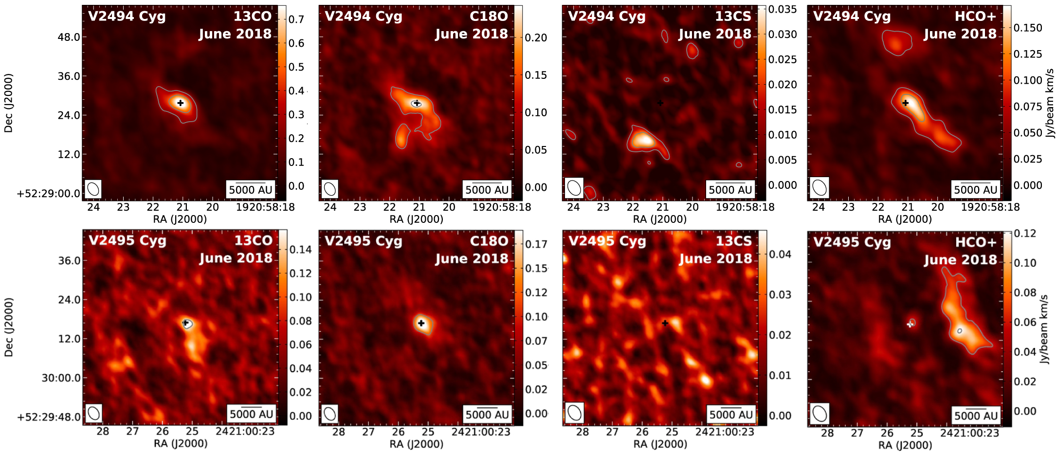 Standard image High-resolution image13CS and HCO+ was observed in V1735 Cyg, V2494 Cyg, and V2495 Cyg in 2018 June and August (Table 5). These lines show no signs of variability, either in flux or spatial morphology. We did not detect 13CS or HCO+ in V2495 Cyg. The emission morphology for 13CS and HCO+ for all objects was consistent throughout 2018, thus we display only one epoch in Figures 6 and 7.