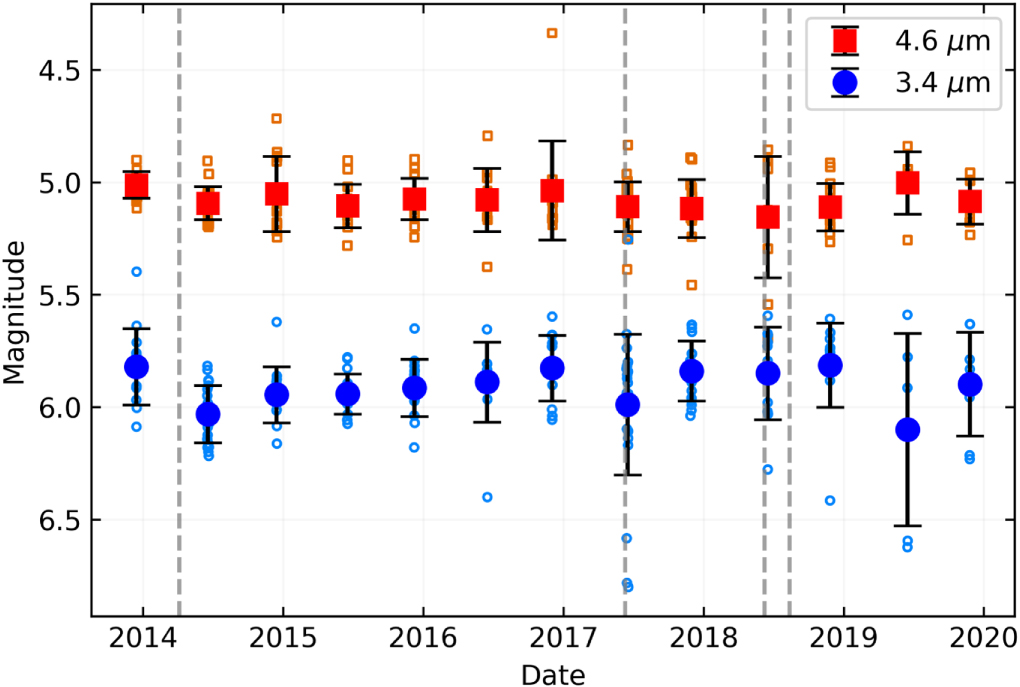 Figure 8. WISE photometry of V1735 Cyg from 2014 to 2019. Red circles are Band 1 (3.4 μm). Blue squares are Band 2 (4.6 μm). Dashed gray bars indicate dates of NOEMA observations.