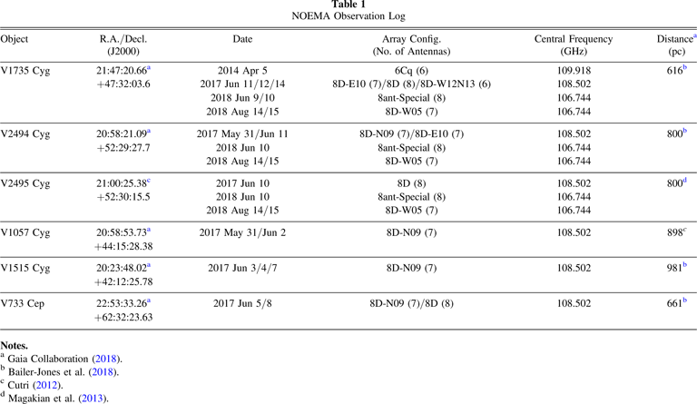 All continuum observations reported here were centered near 108 GHz (∼2.8 mm), while the 2014 observations of V1735 Cyg from F17 were centered near 110 GHz (∼2.7 mm). The 2017 observations used NOEMA's WideX correlator tuned from 106.743 to 110.261 GHz, which covered the 13CO(1–0) (110.201 GHz) and C18O(1–0) (109.782 GHz) lines (see Table 2) at 78.118 kHz resolution. Our 2018 observations used the new PolyFix correlator tuned from 87.399 to 95.117 GHz (lower sideband) and 102.886 to 110.603 GHz (upper sideband). The two frequency ranges allowed us to measure the continuum emission at two different wavelengths, 2.81 and 3.29 mm. These frequencies covered the lines mentioned above, as well as the 13CS(2–1) (92.494 GHz) and HCO+(1–0) (89.189 GHz) lines, at a spectral resolution of 62.495 kHz.