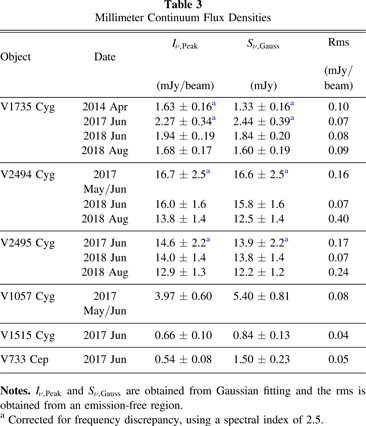 The change in α of V1735 Cyg can be measured using existing data from 2013 June, 2014 April, 2018 June, and 2018 August. Liu et al. (2018) weakly detected V1735 Cyg at 1.3 mm in 2013 June. Given their 3σ upper limits, and using flux density estimates from 2014 April (F17), Liu et al. (2018) determined an upper limit on α of 1.7–2.0. Using the upper (106.7 GHz) and lower (91.3 GHz) sidebands described in Section 2, we are able to determine spectral indices of our 2018 June and August observations. We find tentative evidence of shallower slopes than Liu et al. (2018), α = 1.4 ± 0.4 in 2018 June and α = 1.3 ± 0.7 in 2018 August. These slopes are somewhat lower than the expected spectral index of most circumstellar disks, where generally α = 2–3 (Beckwith & Sargent 1991; Ubach et al. 2012; Liu et al. 2018), and are consistent with free–free emission. We note that the spectral indices we measure with our NOEMA data in V2494 Cyg (α = 2.5–2.6) and V2495 Cyg (α = 2.3–2.5) are in line with those of most circumstellar disks, thus free–free emission was likely not a significant contributor during those observations.