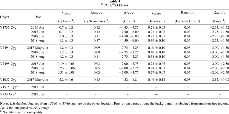 13CO, C18O, 13CS, and HCO+ line fluxes for V1735 Cyg, V2494 Cyg, and V2495 Cyg were extracted from velocity-integrated spectral cubes after continuum subtraction and cleaning. The velocity range used for integration varied per object and per species, but was always centered in the frames that contained emission. In all cases, the same 5