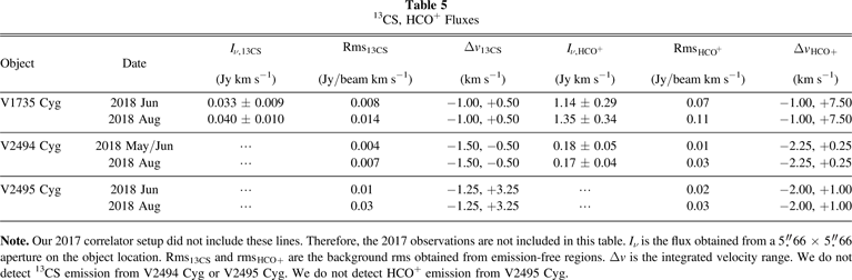 are the background rms obtained from emission-free regions. Δv is the integrated velocity range. We do not detect 13CS emission from V2494 Cyg or V2495 Cyg. We do not detect HCO+ emission from V2495 Cyg.