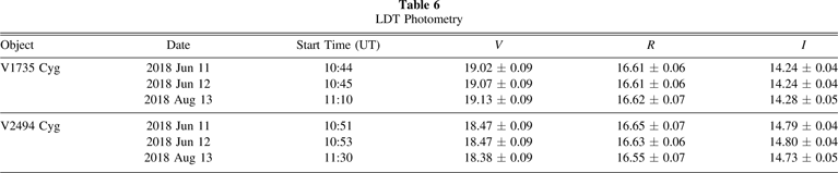 Optical photometry taken in 2018 June and August for V1735 Cyg and V2494 Cyg do not show variability (Table 6) and are consistent with previous observations. Our measurements of V1735 Cyg generally agree with those of Peneva et al. (2009) from 2003 to 2009. They measured V ∼ 18.9 and R ∼ 16.6, but found I ∼ 13.8, about half a magnitude brighter than reported here. Our measurements of V2494 Cyg agree with those of Magakian et al. (2013) from 2003 to 2010 in R and I. They found R ∼ 16.4 and I ∼ 14.7, but did not report V. We note that V2495 Cyg was observed, but not detected (see Section 2.3).