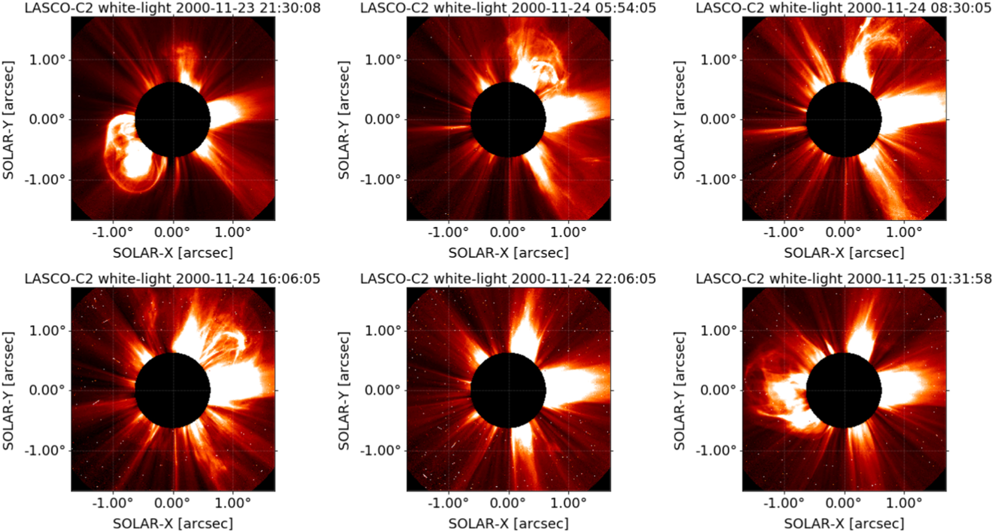 Standard image High-resolution imageFigure 11. Cluster with six members during 2000 November 23–25 with speeds v = 1130, 1278, 1002, 1269, 1012, and 2528 km s−1 and a mean time between successive CMEs of τi ≈ 5.6 hr during the maximum of solar cycle 23.
