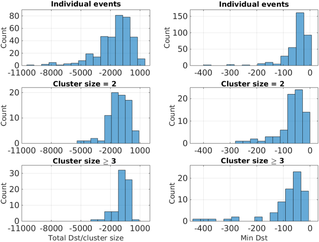 Figure 12. Geoeffectiveness analysis for individual events and clusters from 1998 April to 2014 December. From top to bottom: individual events, clusters with two members and clusters with ≥3 members. The first column corresponds to values of the total hourly sum of Dst per cluster size and the second column corresponds to the minimum value of Dst.