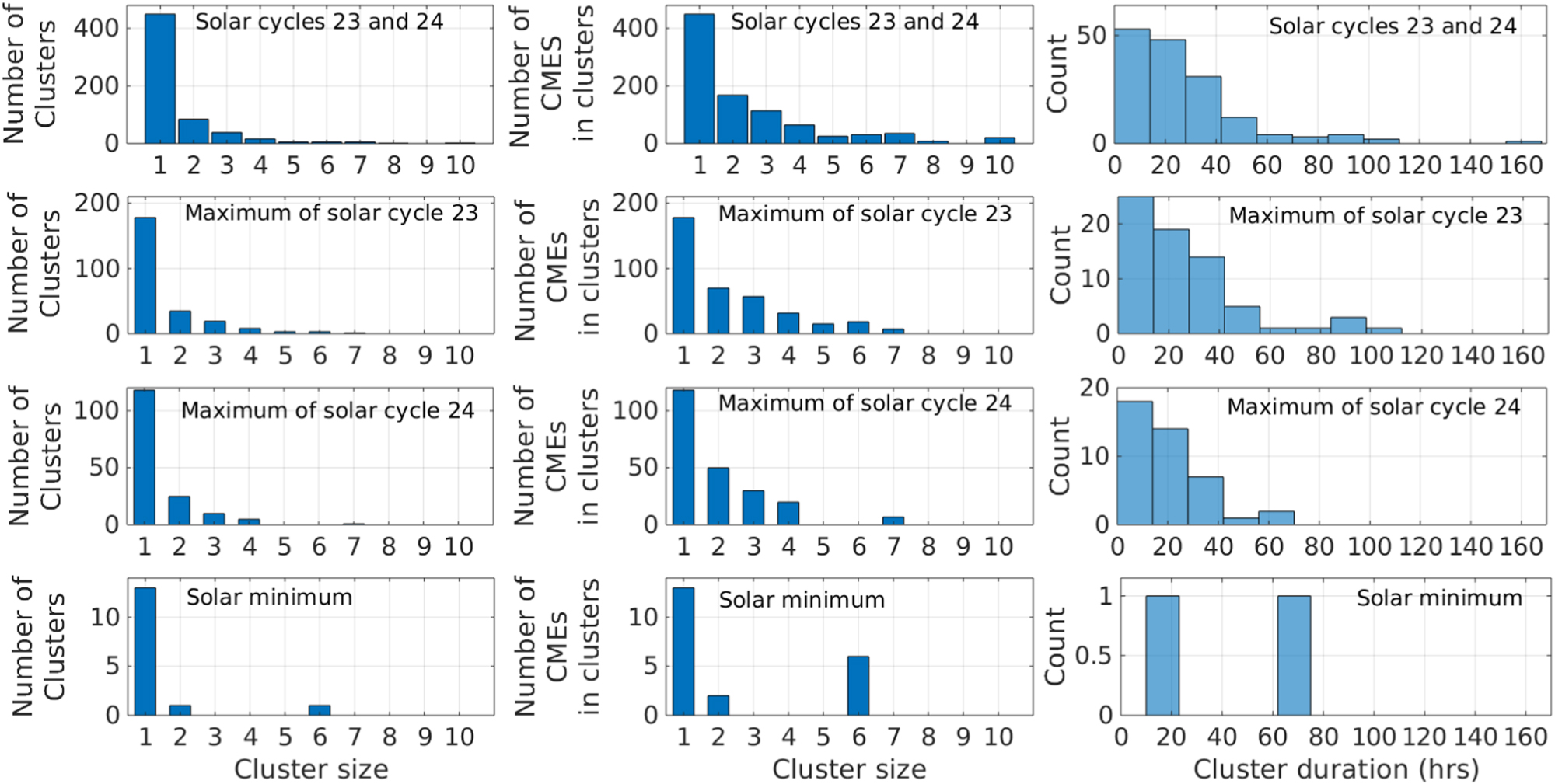 Figure 8. Distribution of cluster sizes (left), the number of CMEs in a cluster (middle), and the cluster duration (right) for fast CMEs with speeds exceeding 1000 km s−1. From top to bottom: solar cycles 23 and 24 (whole interval), maximum of solar cycle 23, maximum of solar cycle 24, and solar minimum between cycles 23 and 24.