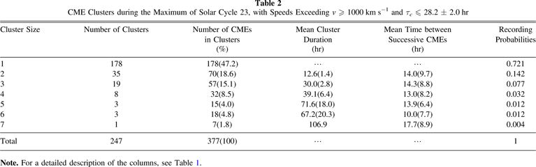 Note. The first column gives the size of clusters. The second column lists the number of clusters of a certain size. The third column gives the total number of CMEs in these clusters and their percentages. The fourth column lists the mean duration of the cluster with the standard error in parentheses. The fifth column lists the mean time between successive CMEs in each cluster with the standard deviation in parentheses. The sixth column provides an estimate of the probabilities that a cluster of the corresponding size is recorded, which is the number of clusters of specific size divided by the total number of clusters.