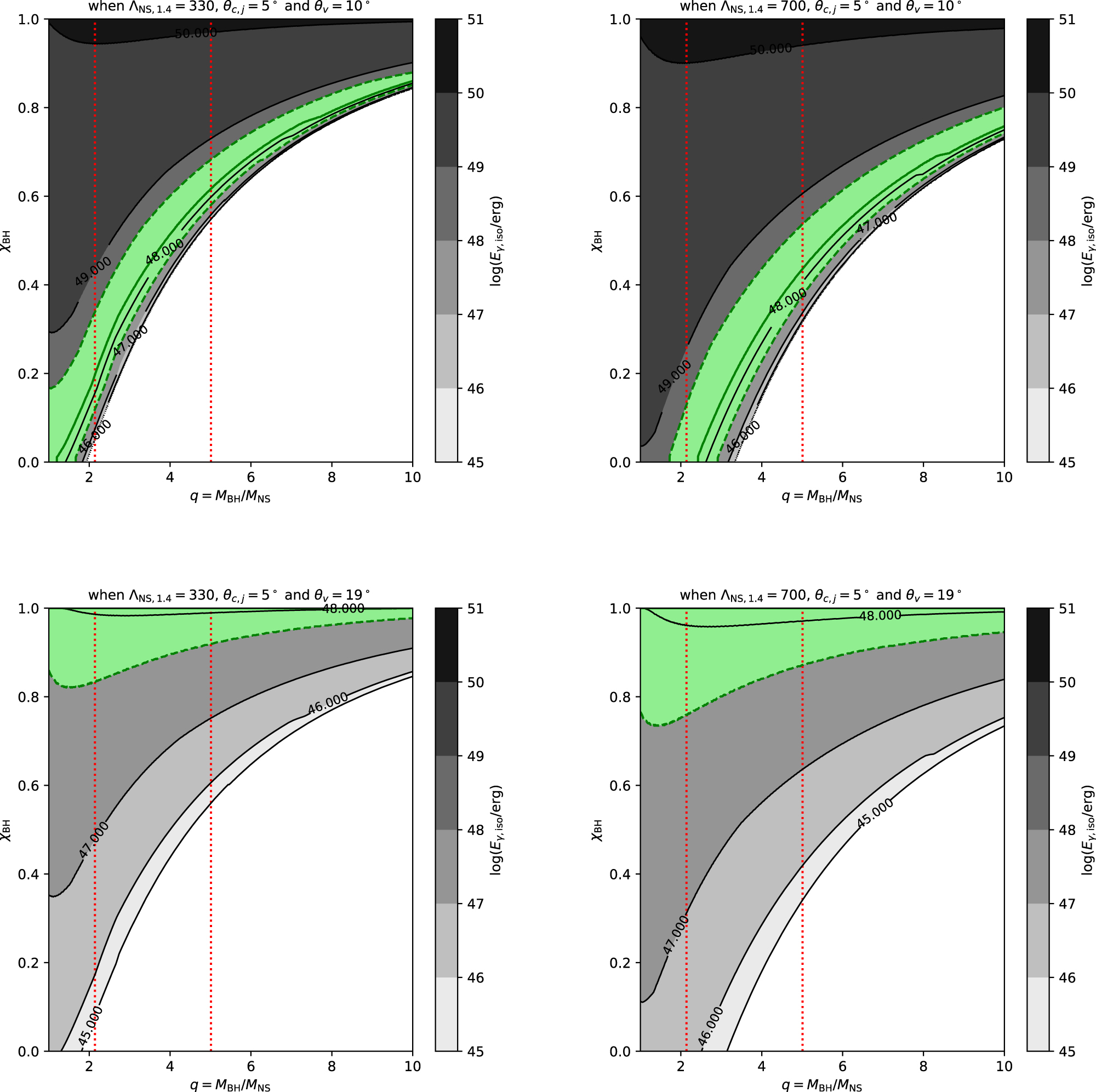 Standard image High-resolution imageThe constraints presented in Figures 10 and 11 are by no means definite. This is because from merger parameters to the observed GRB parameters, there are three major steps in modeling, which involve many unknown parameters: First, the uncertainties in the NS–BH merger physics may introduce a large error in the disk mass. Second, jet launching from a BH–disk system in principle involves two possible mechanisms: neutrino-antineutrino annihilation (Popham et al. 1999) or Blandford–Znajek (BZ) mechanism (Blandford & Znajek 1977) and we only considered the latter mechanism. Furthermore, we have adopted a simple analytical formula to denote the BZ power. Third, the radiation efficiency (which depends on the energy dissipation site and mechanism, e.g., photosphere emission, internal shocks, or magnetic dissipation) and geometry (jet structure and viewing angle) are essential to determine how a BZ-powered jet is observed as a short GRB. As explained above, when deriving (q, χBH) presented in Figures 10 and 11, we have adopted the typical values for some parameters based on the best known models. Allowing broader distributions of these parameters would further weaken the constraints.