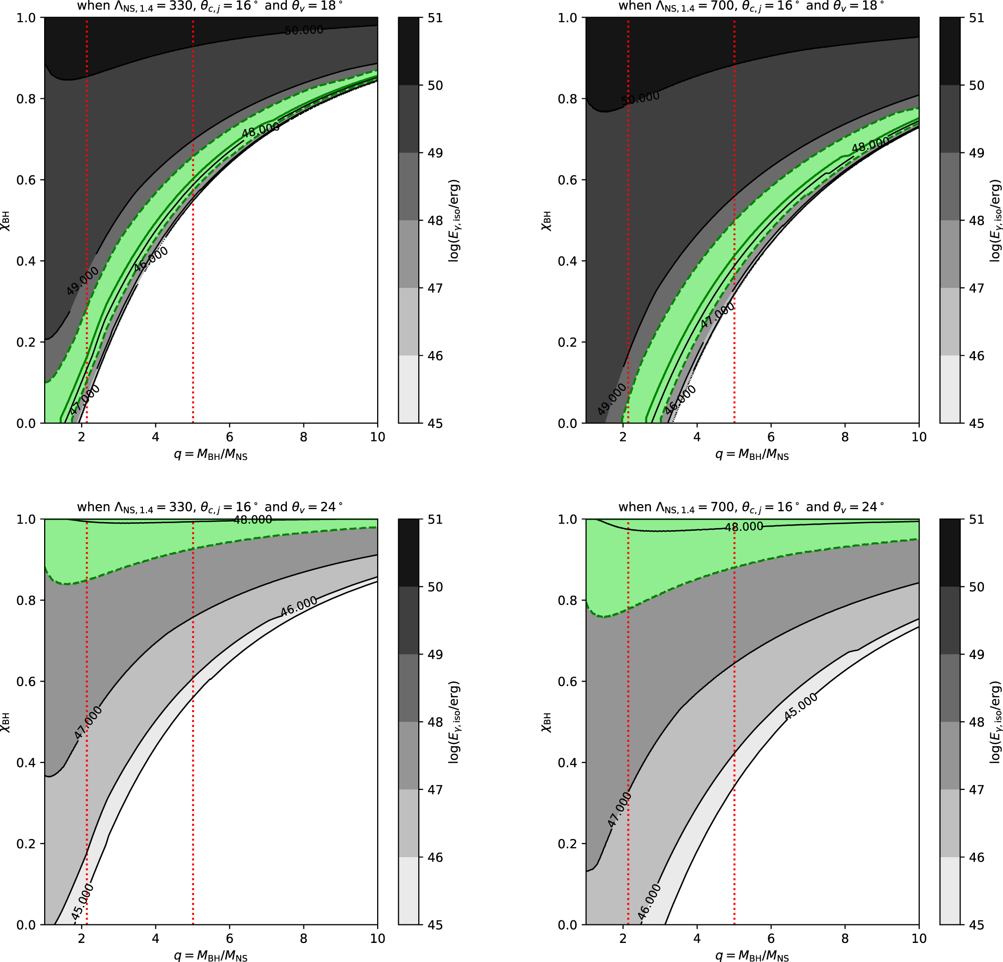 = 0.015, ξw = 0.01, ηγ = 10%, MNS = 1.4 M⊙, and Γc = 100 (see Barbieri et al. 2020). Since we do not know the NS equation of state, we take ΛNS,1.4 = 330 (SFHo EoS) and 700 (DD2 EoS) to cover a range of possible cases. Furthermore, we consider two example cases for a narrow jet core with θc,j = 5° and a wide jet core with θc,j = 16°. The former value is motivated by GW170817/GRB 170817A (Ghirlanda et al. 2019) while the latter is consistent with the claimed opening angle of some observed short GRBs (Fong et al. 2015). Our constraints on q and χBH for different cases are presented in Figures 10 and 11. Despite the flexible allowed range of q and χBH, our results suggest that the viewing angle should lie in the most possible range in order to achieve observed Eγ,iso, which is 10°–19° (18°–24°) for the narrow (wide) jet core cases, respectively, as shown in Figure 10 (Figure 11). In addition, different ΛNS,1.4 values (corresponding to different NS EoSs) can visibly influence the green regions in the q-χBH plane achieving the observed Eγ,iso, but it does not significantly change the most possible allowed ranges of the viewing angle.