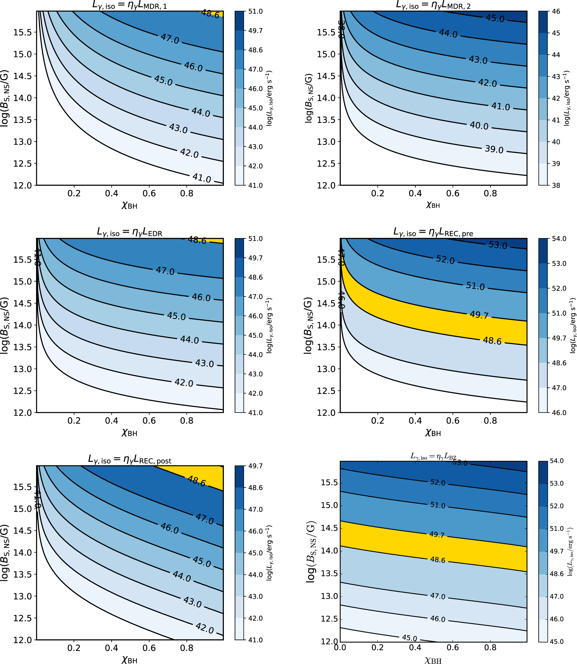 Figure 12. Contours of isotropic gamma-ray radiation luminosities from various pre-merger and the post-merger mechanisms. From left to right and top to bottom the six panels denote the first magnetic dipole radiation (MDR,1), the second magnetic dipole radiation (MDR,2), the electric dipole radiation (EDR), the pre-merger magnetic reconnection (REC, pre), the post-merger magnetic reconnection (REC, post), and the BZ mechanism (BZ). All the contours are plotted in the plane of the pre-merger BH spin χBH and NS surface magnetic field strength BS,NS. The yellow regions represent the isotropic gamma-ray radiation luminosity log(Lγ,iso/erg s−1) ∼ 48.6–49.7 of the subthreshold GRB GBM-190816. The radiative efficiency is adopted as ηγ = 1. The mass ratio q = 5, the NS mass MNS = 1.4 M⊙ and radius rNS = 12 km are adopted in the numerical calculations.