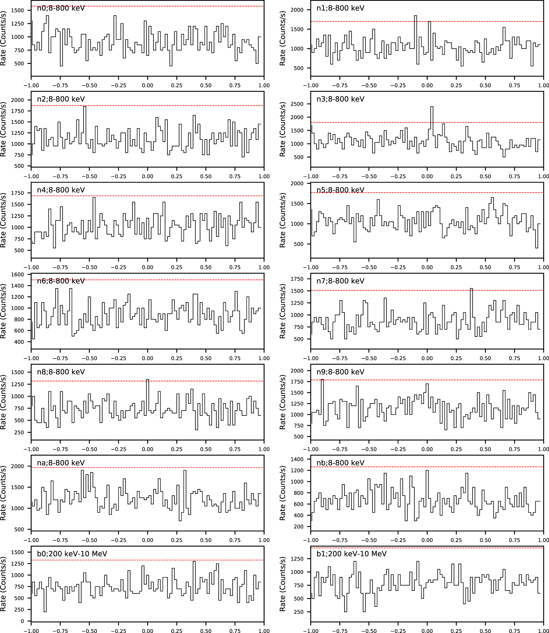 Figure 1. Light curves around T0 of all 14 detectors. The time bin size is 0.02 s. The N3 detector panel shows a sharp peak around T0. The red horizontal dashed lines represent the 3σ level for each detector.