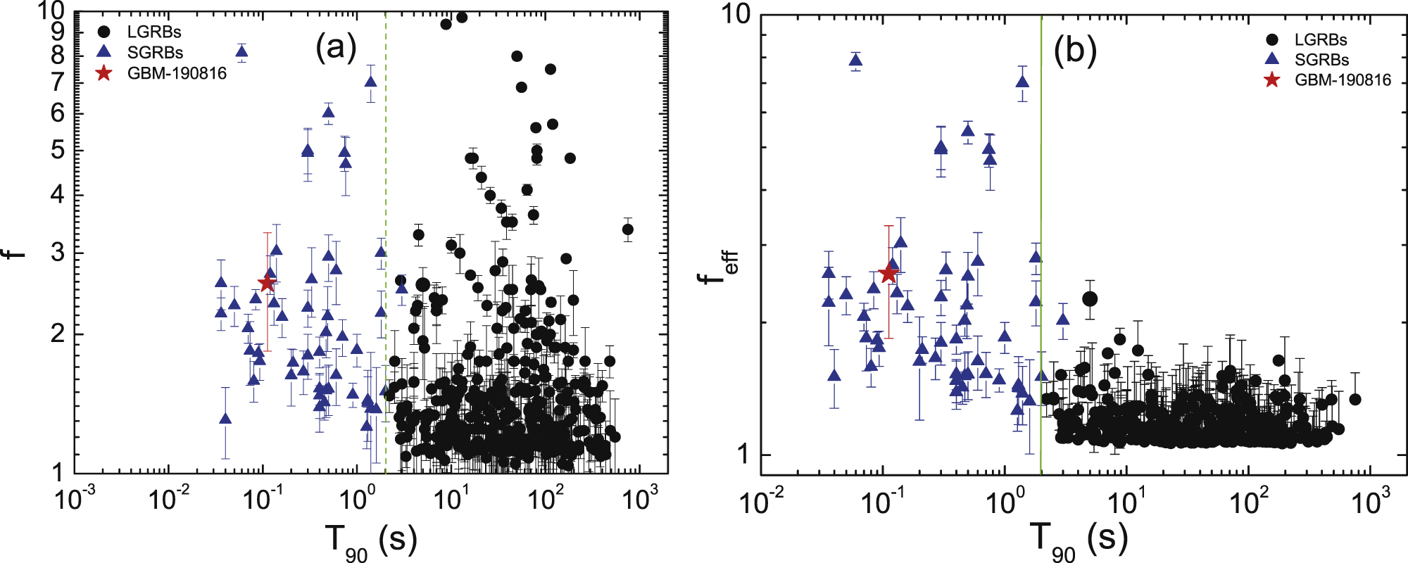 Standard image High-resolution image(3) Amplitude parameter of GBM-190816. Lü et al. (2014) defined two "amplitude parameters" to assist burst classifications: the parameter f denotes the ratio between the peak flux and the average background flux, and feff denotes the ratio between the peak flux of a pseudo-burst and the average background flux. The pseudo-burst is defined by scaling down the peak flux until the measured duration of a long burst is shorter than two seconds (Lü et al. 2014). For short GRBs, f = feff. Statistically, the feff parameters of long GRBs are typically smaller than f of short GRBs, providing a criterion to identify contaminated long GRBs in the observed short GRB sample due to the "tip-of-the-iceberg" effect. We perform the f analysis to GBM-190816, and obtain f = 2.58 ± 0.37. Figures 4(a) and (b) show T90 as functions of f and feff for both long and short GRBs, where GBM-190816 is highlighted as a star. We find that its amplitude parameter is generally larger than feff of typical long GRBs, consistent with being a typical short GRB. Moreover, we calculate the probability of GBM-190816 being a disguised short GRB according to the p − f relation derived by Lü et al. (2014). We find that such a probability is p ∼ 0.03. All these suggest that GBM-190816 is a genuine short GRB. Nonetheless, there is a nonnegligible probability that the observed spike could still be the "tip of the iceberg" of a longer short burst (see more discussion in Section 4.3).