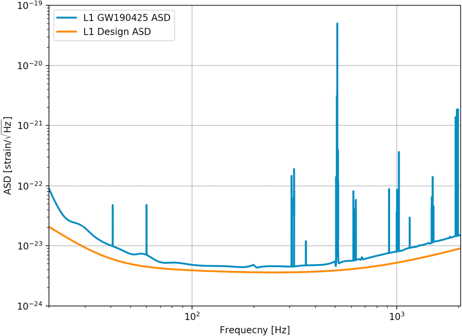 Figure 7. GW190425 L1 ASD and the aLIGO L1 design ASD.