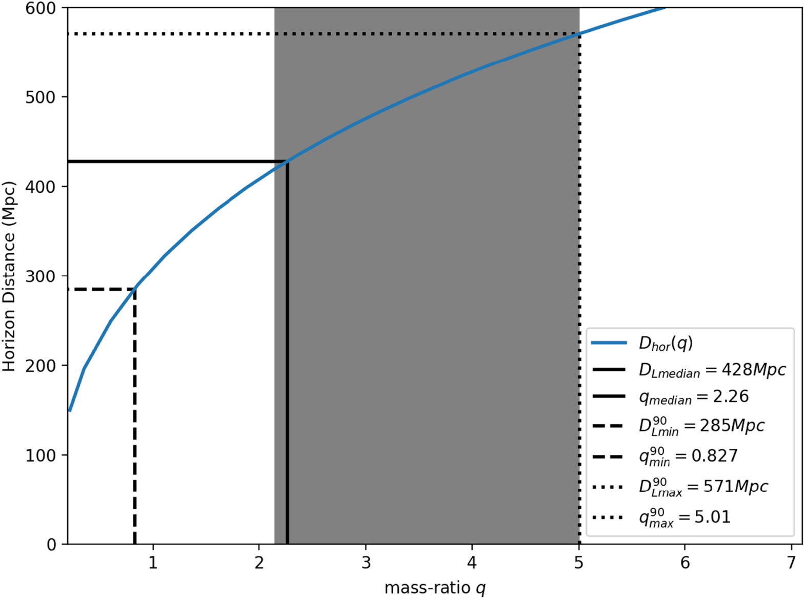 Standard image High-resolution imageIn the following, we demonstrate that by calculating the horizon distance of the L1 detector for different CBC GW signals with various mass ratios, we can constrain the mass ratio of the GBM-190816 event to a specific range under the aforementioned assumptions. We assume that the orbital eccentricity at the merger is