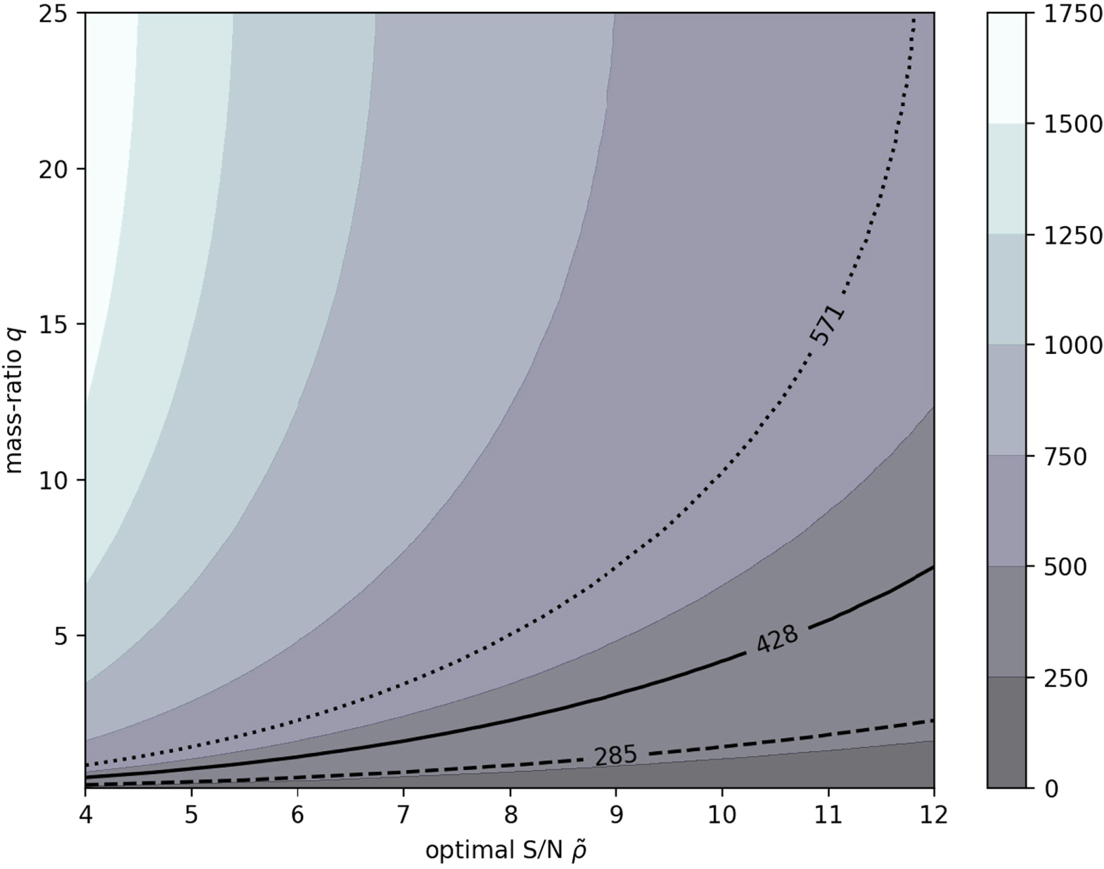 Figure 9. Inferred mass ratio q range on different chosen optimal S/N. The dashed and dotted lines represent the lower and upper limits (90% CI) of the reported luminosity distance. The solid line represents the median value of the reported luminosity distance. The gray area represents contours of the horizon distance at given S/N and q.