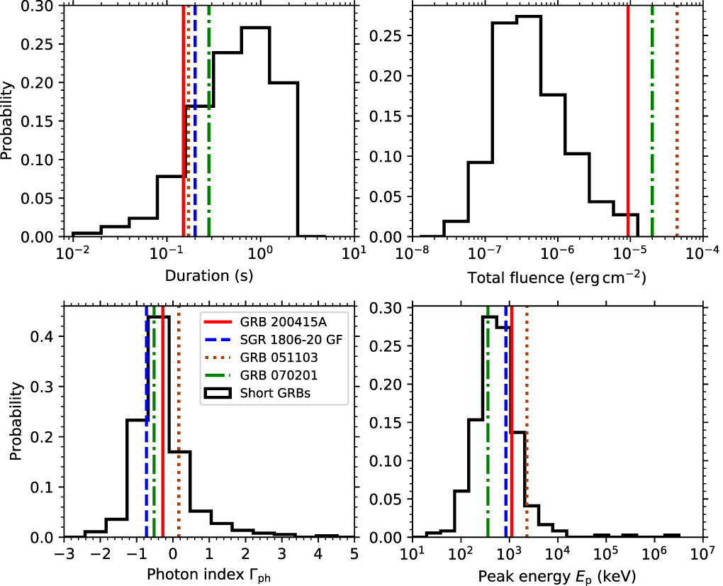 Figure 11. Probability distributions of the parameters of short GRBs. This short GRB sample is from the Fermi/GBM burst catalog. Here GRB 200415A, the GF from SGR 1806–20, GRB 051103, and GRB 070201 are placed in parameter space. The top left panel utilizes the total durations for GRB 200415A (150 ms), GRB 051103 (170 ms), and GRB 070201 (280 ms) but the duration of the initial pulse for the SGR 1806–20 GF (200 ms).