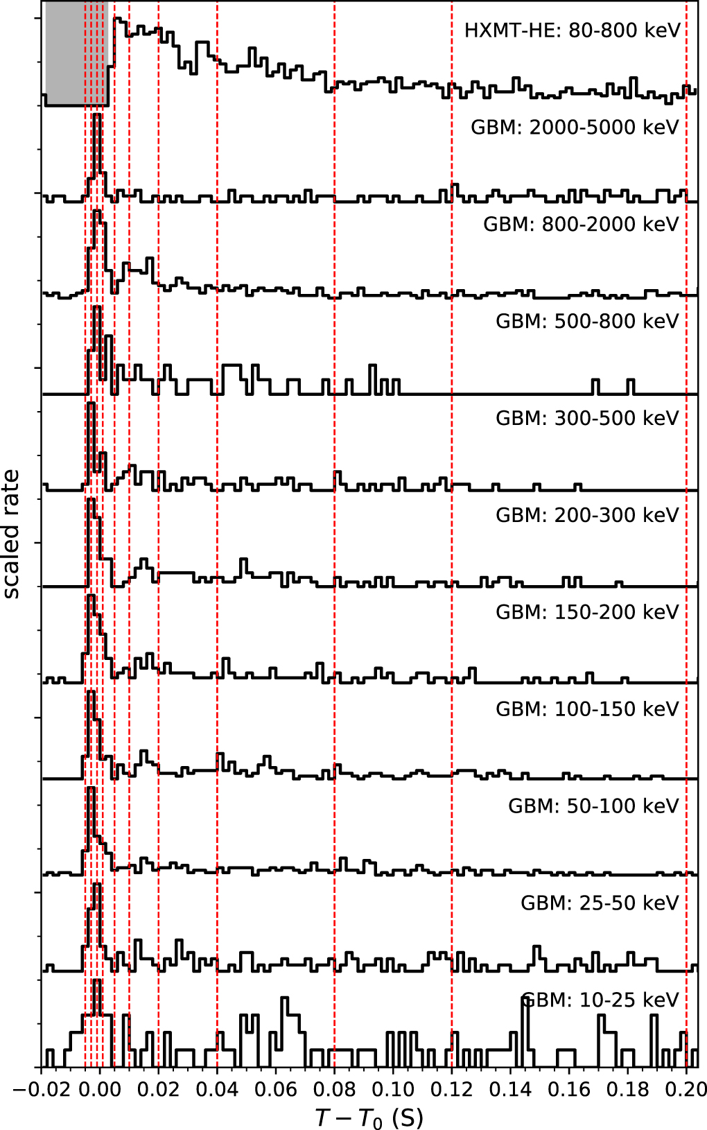 The multiwavelength light curves of this burst are shown in Figure 1 and derived from the photons collected by sodium iodide (NaI) detector n1 and bismuth germanium oxide (BGO) detector b0. The background is modeled via applying the "baseline" method (Zhang et al. 2018) to a wide time interval around the signal and subtracted in GBM light curves. The light curve obtained from HXMT-HE within 80–800 keV is added to the topmost panel in Figure 1. The correction of the aberration of light effect, which is 15.04 ms in terms of photon arrival time difference when they reached the GBM and HXMT-HE detectors, has been applied on the HXMT data. The count rates in the HXMT-HE light curve have also been corrected for the dead time and saturation (Xiao et al. 2020). The early 21 ms saturation time of HXMT-HE is shown with a gray shaded area in Figure 1. The light curves show a sharp peak at ∼T0 with a duration of