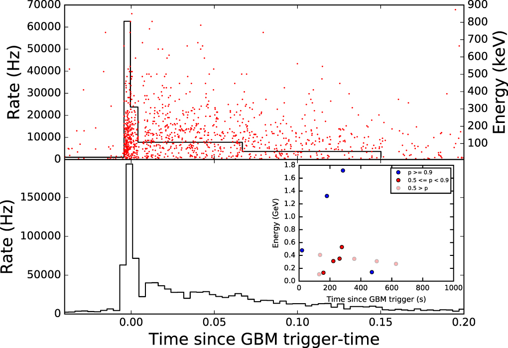 Standard image High-resolution imageFigure 3. Light curves of GRB 200415A. Upper panel: Bayesian block light curve for GBM-n1 and energy scatters in the 8–900 keV range. Lower panel: combined light curve from the NaI detectors (n0, n1, n3, and n5) with the minimum Bayesian block bin size (3.8 ms). Inset: LAT-HE observations in 0–1000 s.