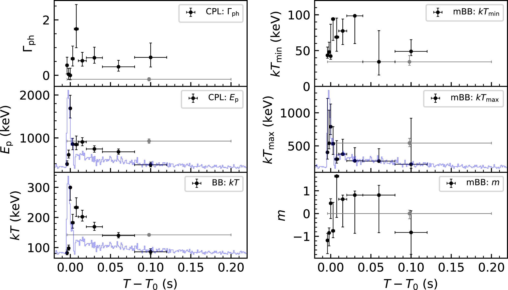 of the expanding fireball, which overlaps into an mBB spectrum. We note that such restrictions on temperature are similar to those of our mBB spectral fitting during the first spike (Table 1). On the other hand, for the peak time-dependent spectrum measured from