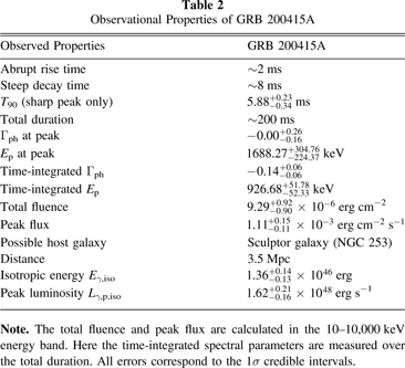Note. The spectral properties of GRB 200415A are given by the best models of time-integrated spectra. The distance of ∼8.7 kpc to the location of SGR 1806–20 is suggested by Bibby et al. (2008).