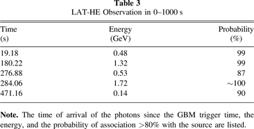 Assuming that GRB 200415A is an SGR GF at a distance of 3.5 Mpc, it is the first detection of GeV emission that is coincident with a GF. The first high-energy photon was detected at ∼19 s after the onset of GRB 200415A, whose energy is 480 MeV. The photon number spectrum during 0–1000 s in the 0.1–10 GeV band is