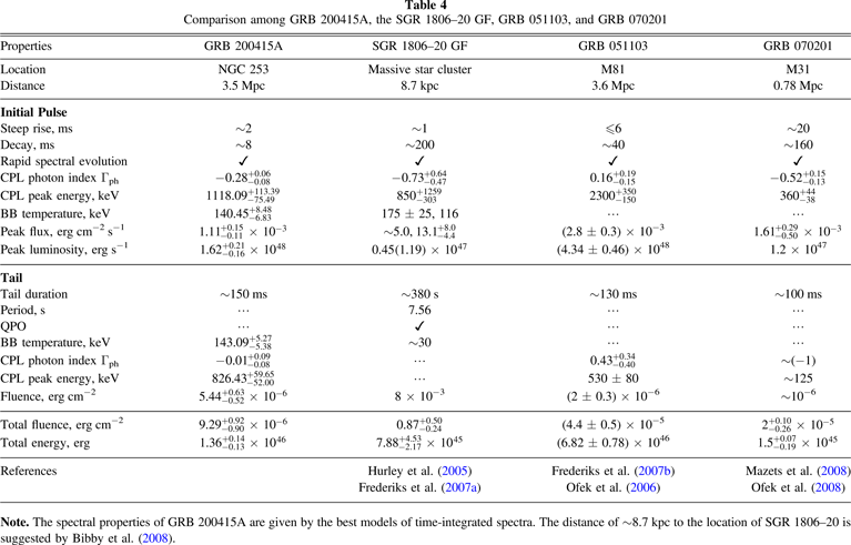 Table 4. Comparison among GRB 200415A, the SGR 1806–20 GF, GRB 051103, and GRB 070201
