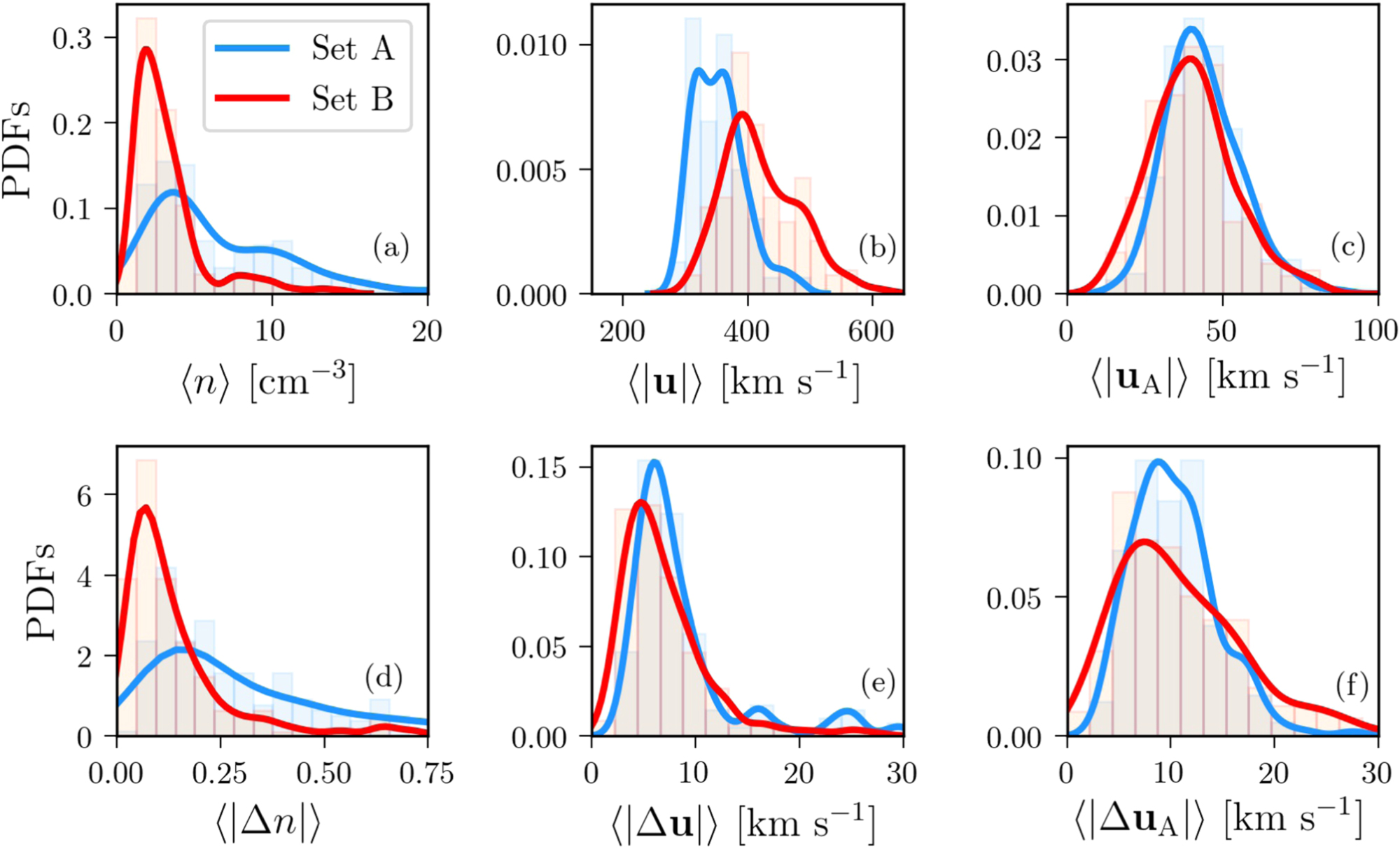 Standard image High-resolution imageFigure 2 shows the probability distribution functions (PDFs) for all the analyzed events in both sets for (a)–(c) the number density, velocity, and Alfvén velocity field absolute values and for (d)–(f) its fluctuation amplitudes, respectively. Both sets have similar distributions for the fluctuation values.