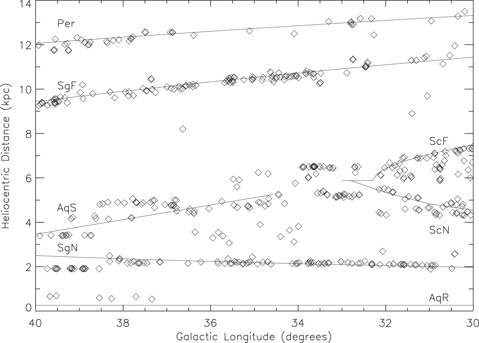Figure 1. The YB spatial distribution. Heliocentric distances and Galactic longitudes are plotted for all 493 YBs in the pilot region with CO associations (diamonds). The average statistical uncertainty in the distance is ∼0.5 kpc. Lines show the spiral arm tracers along this line of sight from Reid et al. (2016): Per = Perseus, SgN and SgF = Sagittarius near and far sections, ScN and ScF = Scutum near and far sections, AqR = the local Aquila Rift feature, and AqS = the Aquila spur between SgN and ScN.