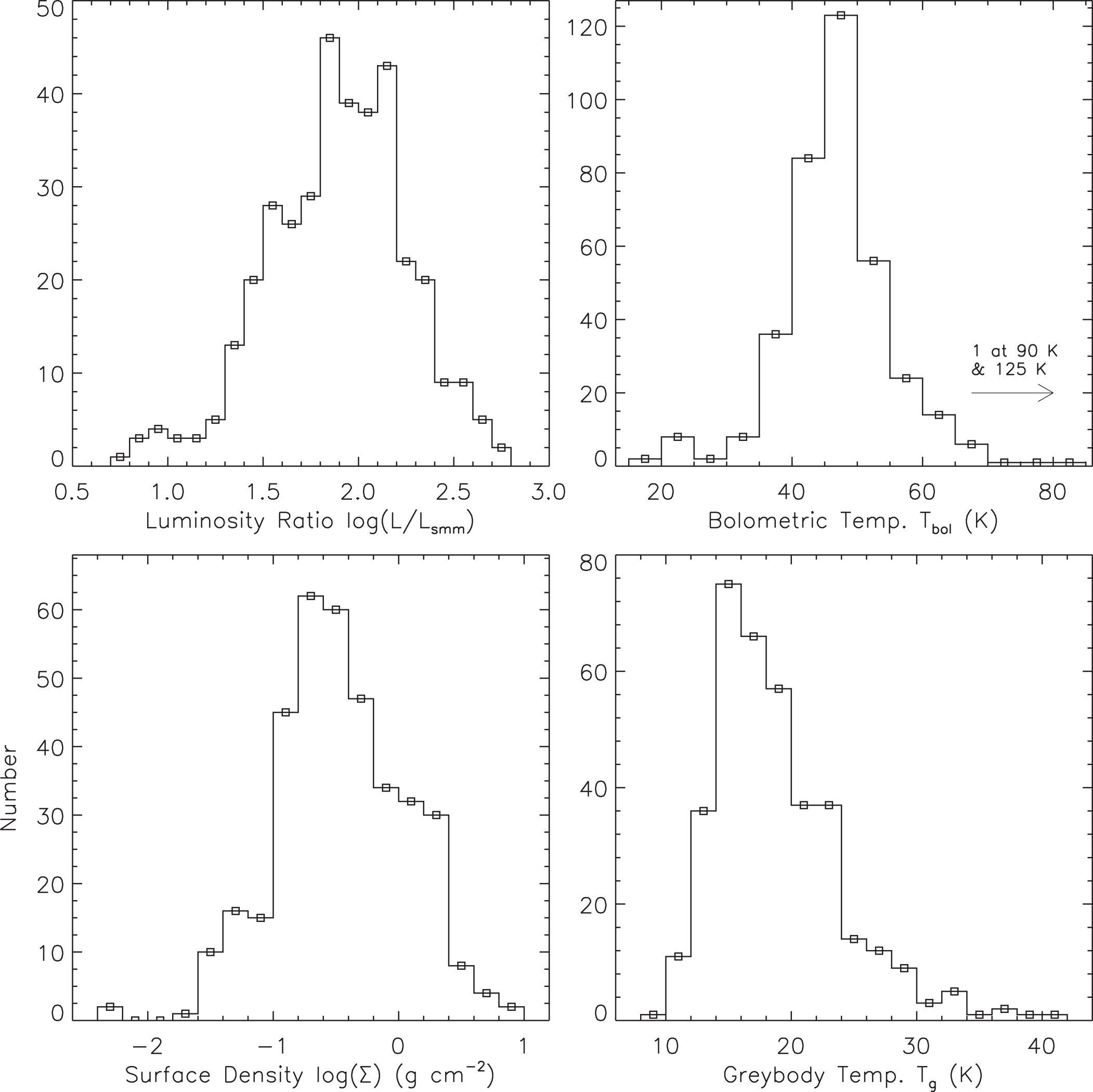 Finally, the temperature used in the graybody fits to the Herschel SEDs at λ ≥ 160 μm (Tgray) is shown in the lower right panel of Figure 3. The distribution is similar to the protostellar Tgray distribution shown in Figure 5 of EMS17. The YB–Hi-GAL distribution has a slightly higher average temperature (18.8 K) than the protostellar sample (16.0 K), but it shares approximately the same low-temperature cutoff and high-temperature tail.