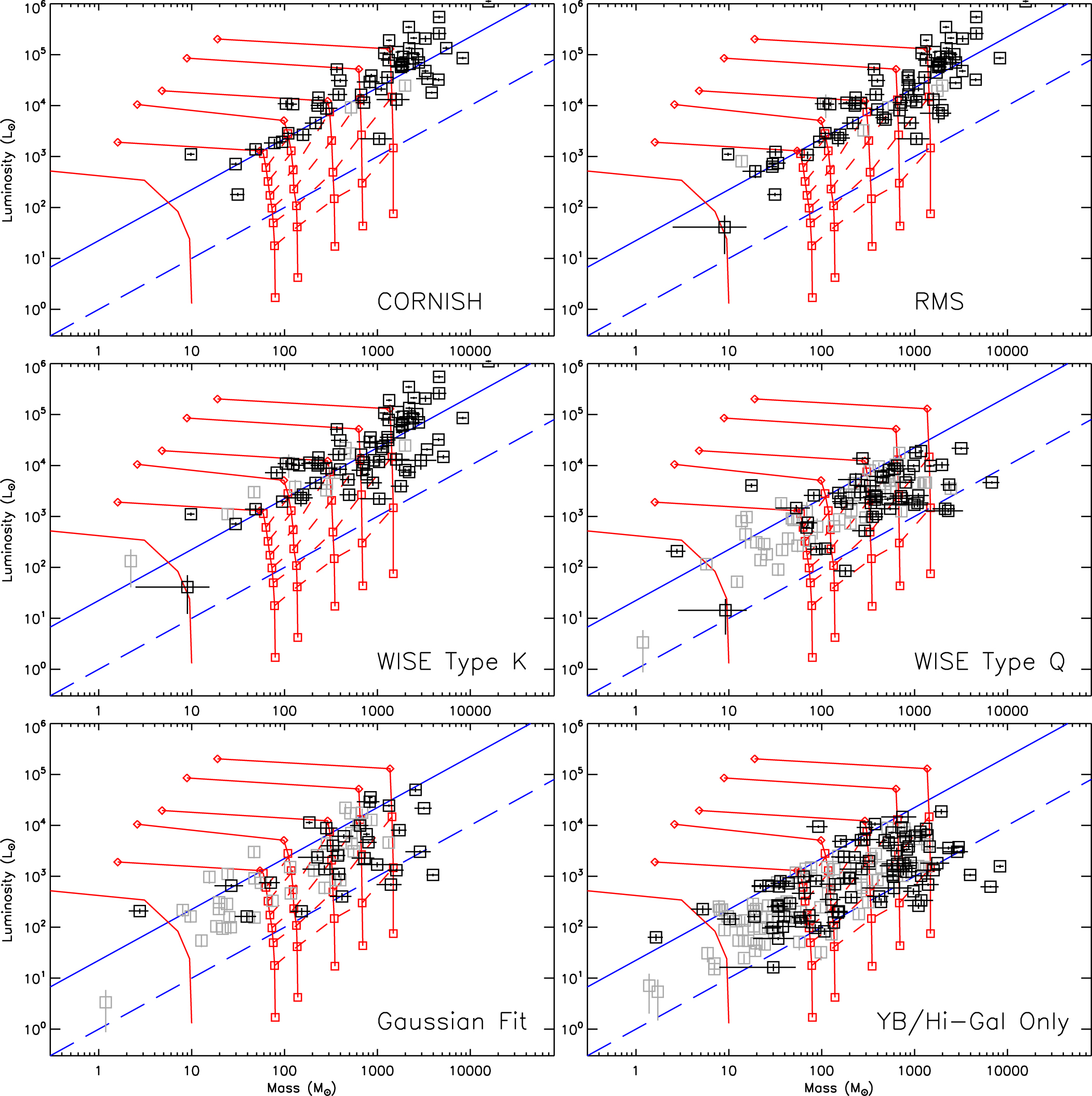 line. They also tend to be near the vertical–horizontal transition region for the various evolutionary tracks, as would be expected for objects like compact H ii regions, which represent fairly evolved states of massive star evolution. Note that there is significant overlap between these three groups (see Table 2). In contrast, objects that are radio-quiet (WISE Q), well fit by 2D Gaussians, and YBs with only Hi-GAL matches tend to lie along the active accreting portion of the evolutionary tracks for a wide range of clump masses and luminosity. There is also a noticeable deficit of these sources (compared to the CORNISH, RMS, and WISE K samples) in the upper right corner of the L–M plots (M > 103