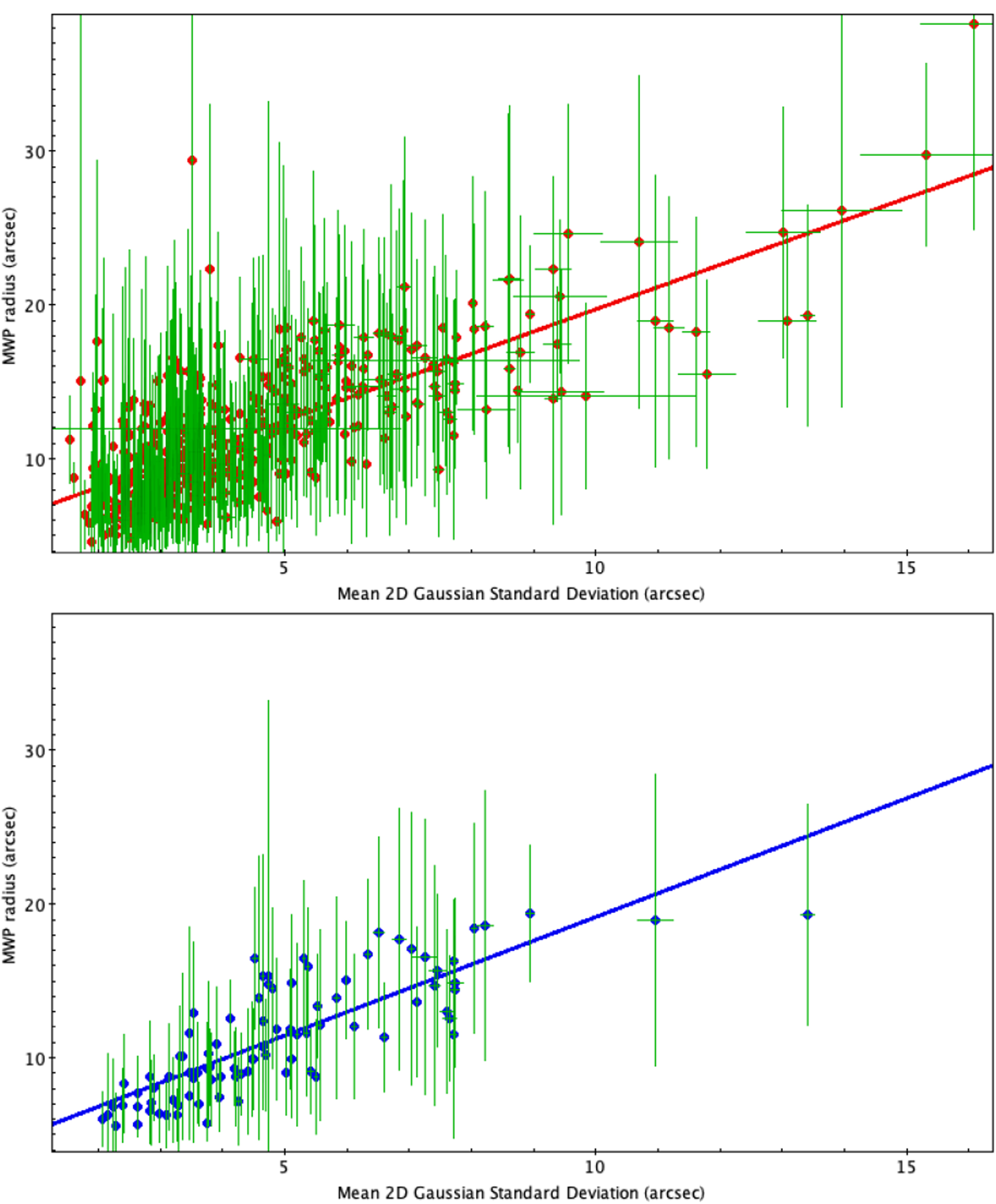 Figure 8. The MWP radius vs. mean 2D Gaussian standard deviation for unsaturated YBs. Top panel: 450 YBs (red symbols and linear fit). Bottom panel: subset of 89 well-fit YBs (blue symbols and linear fits). Error bars are shown in green. Many of the errors on the Gaussian standard deviations are too small to be visible.