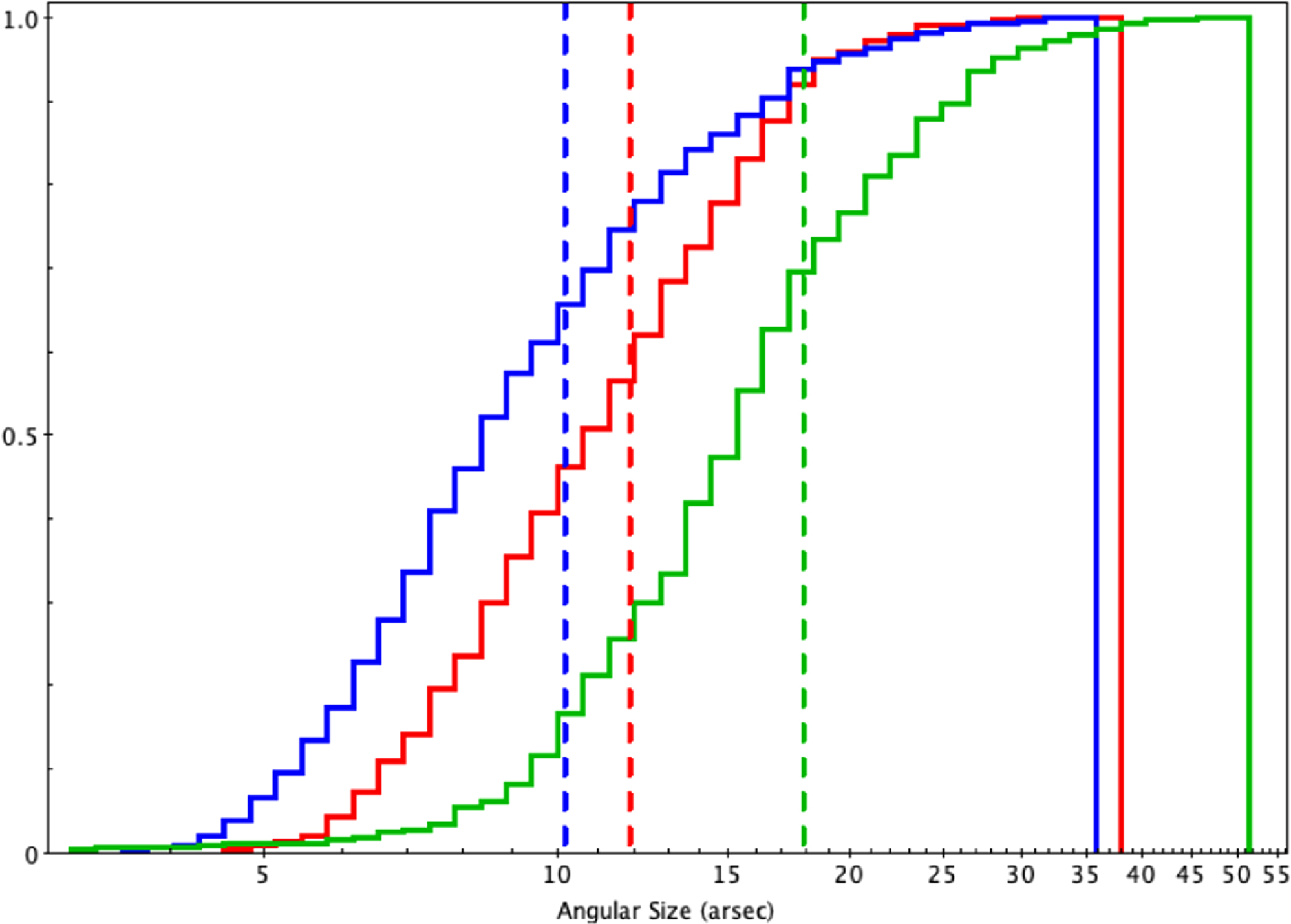 Figure 9. Normalized cumulative histograms for user-measured MWP radii (red), 2D Gaussian FWHM (blue), and Hi-GAL 250 μm FWHM (green) YB size distributions. Dashed vertical lines indicate the mean angular sizes for each distribution using the same colors.