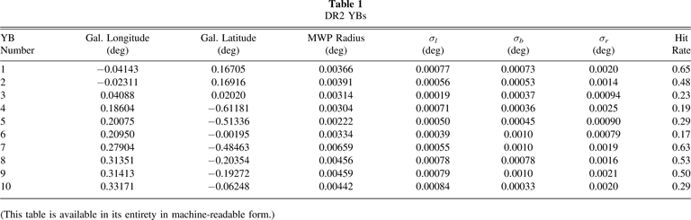 | YB | Gal. Longitude | Gal. Latitude | MWP Radius | σl | σb | σr | Hit |