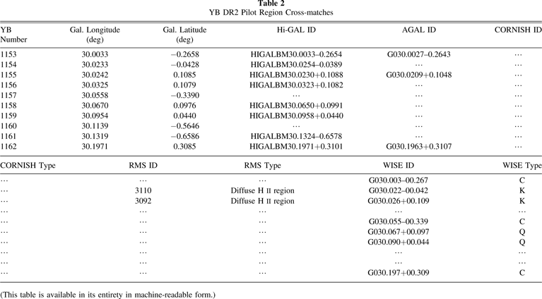 Thus, we have opted to perform an initial analysis of all of the YBs that were included in the l = 30°–40°, b = ±1° region after clustering and averaging was performed. This region contains 516 YBs, with a negligible 10 YBs that achieved hit rates less than the 0.125 cutoff employed for DR2 bubbles. The region was chosen because it is covered in numerous other Galactic plane surveys and overlaps with multiple catalogs, which are discussed further in Section 3.1.