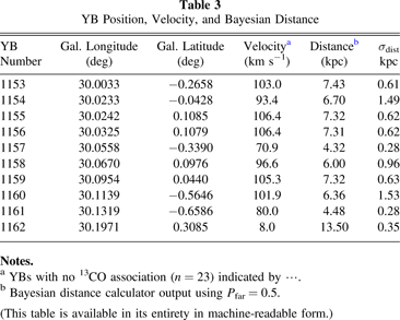 a YBs with no 13CO association (n = 23) indicated by ⋯. b Bayesian distance calculator output using Pfar = 0.5.Only a portion of this table is shown here to demonstrate its form and content. A machine-readable version of the full table is available.