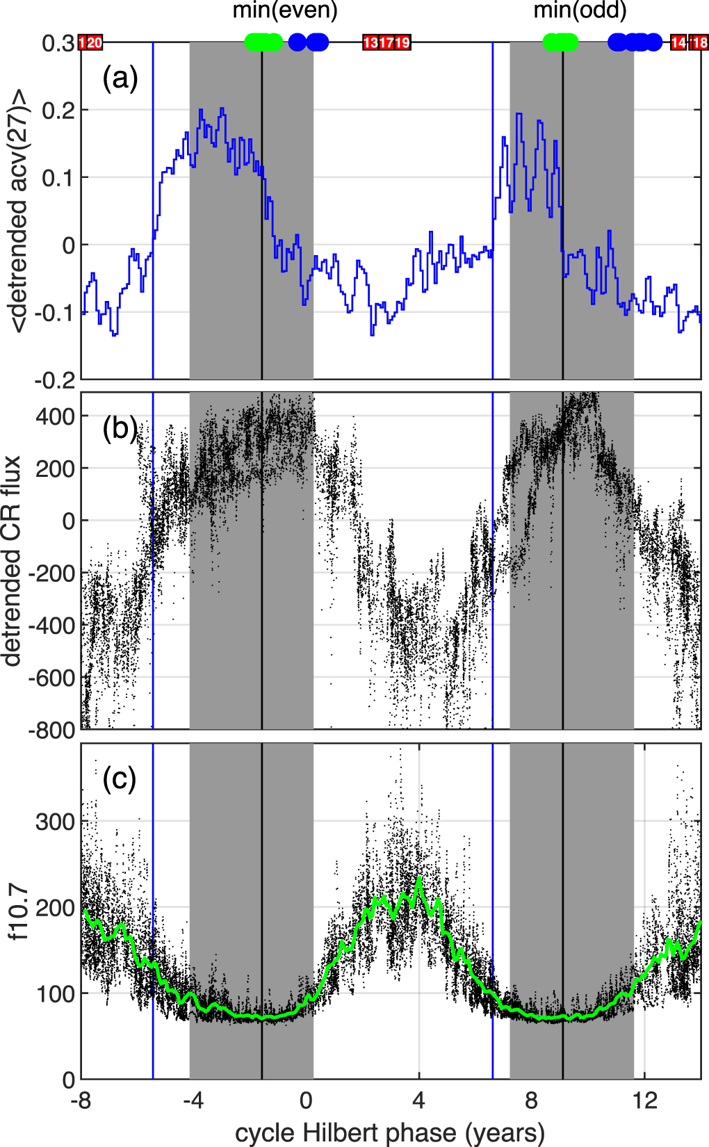 Standard image High-resolution imageFigure 10. Hale cycle clock phase plotted linearly; the normalized 22 yr Hale cycle (phase [0, 4π] from the Hilbert transform of daily SSN). The format follows that of Figure 7. Panel (a): 〈acv(27)〉 (blue trace) with blue vertical lines at the zero upcrossings; panel (b): detrended daily cosmic ray flux (black); panel (c): daily F10.7 (black) and its average (green) obtained by dividing the normalized 22 yr Hale cycle into 12 × 22 month long intervals and averaging the values of daily F10.7 that fall within each of these intervals over multiple Hale cycles.