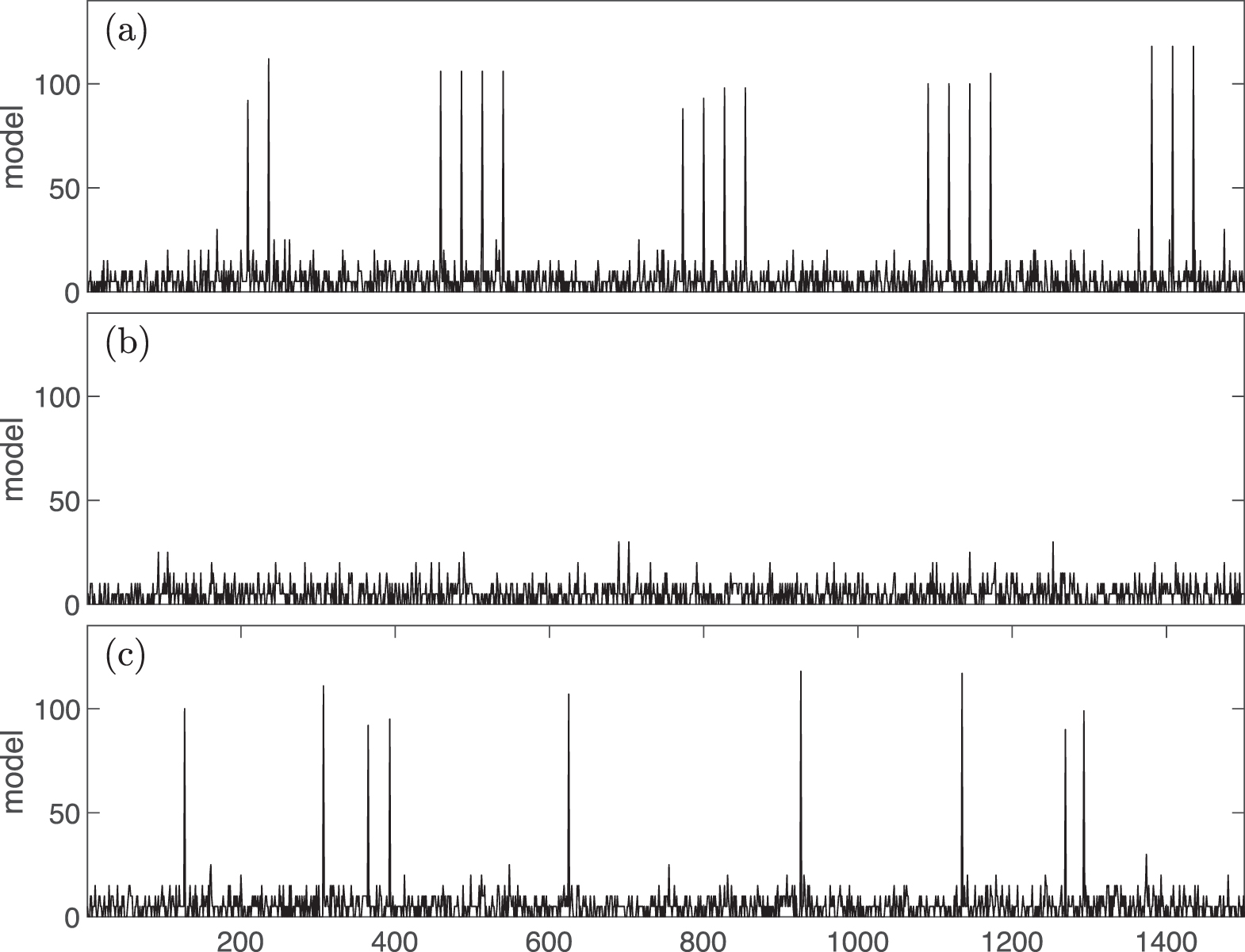 that are both discrete and positive definite, as is the aa index. In the model the noise is the sequence 5zk,1 with λ = 1. The signal is the sequence zk,100 with λ = 100. Each modeled "day" of data is then a randomly generated value for the noise, plus that of the signal if it has occurred on that day. Early in the model data sequence, the signal is organized into short runs of spikes with a 27 day recurrence as can be seen in panel (a) of Figure 2. These model recurrent co-rotating streams. The runs are randomly spaced, with a spacing 1 + zk,200 and λ = 200 and each run contains a random number of streams 1 + zk,2, λ = 2. The only non-random feature of these streams is their 27 day recurrence. For t < 1000 the amplitude of the signal is twice that in the rest of the sequence. Next in the model data there is an interval of noise only; see panel (b) of Figure 2. Finally for t > 3000 the signal is comprised of randomly occurring (uniformly distributed) spikes; see panel (c) of Figure 2.
