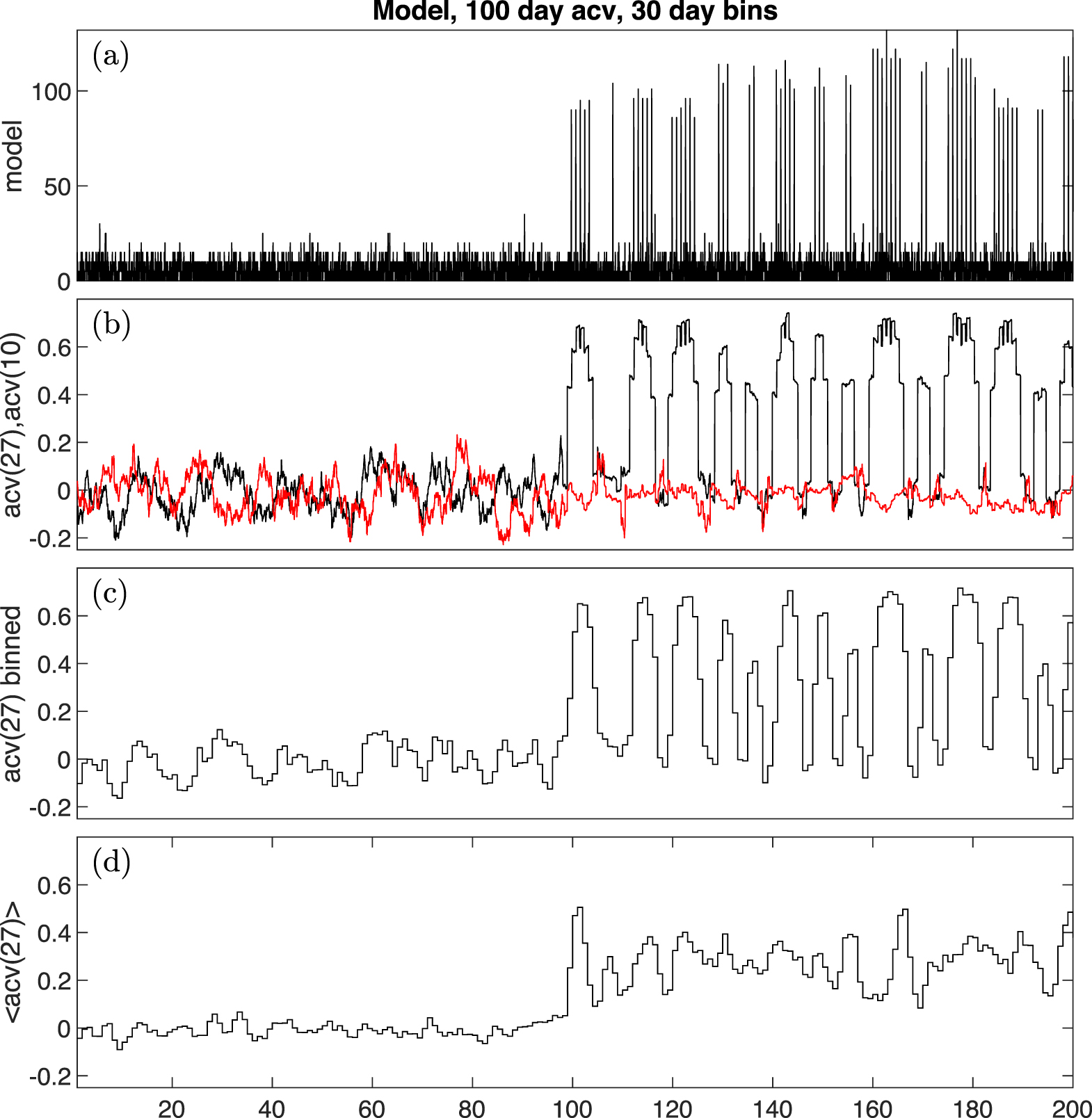 Figure 4. Construction of the epoch-averaged 〈acv(27)〉 for model data with a sharp "switch on" of 27 day recurrences. The panels plot (a) one realization of the model data, (b) its running 100 sample autocovariance at lag 27 (acv(27), black) and lag 10 (red), (c) the acv(27) binned into non-overlapping 30 point averages, (d) an epoch average of acv(27) obtained by averaging across seven realizations of the modeled data.