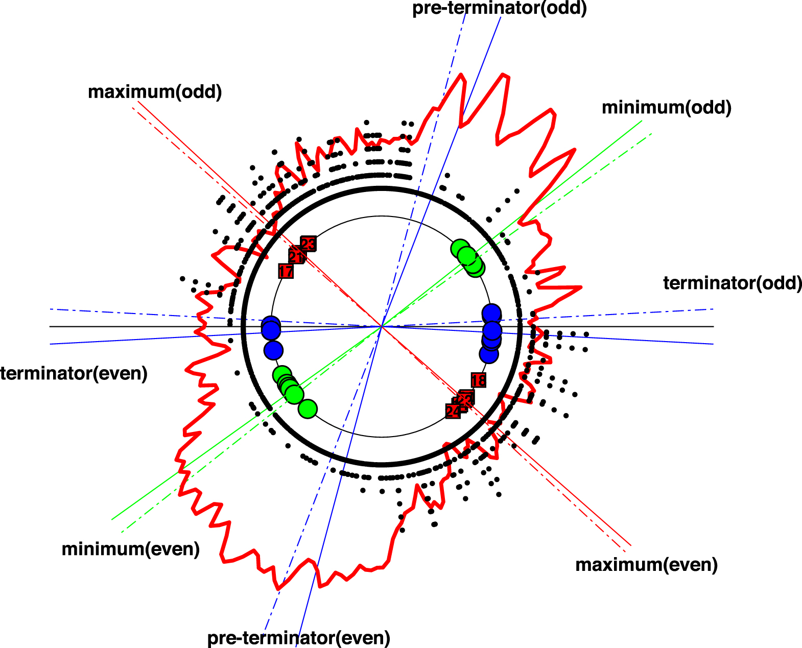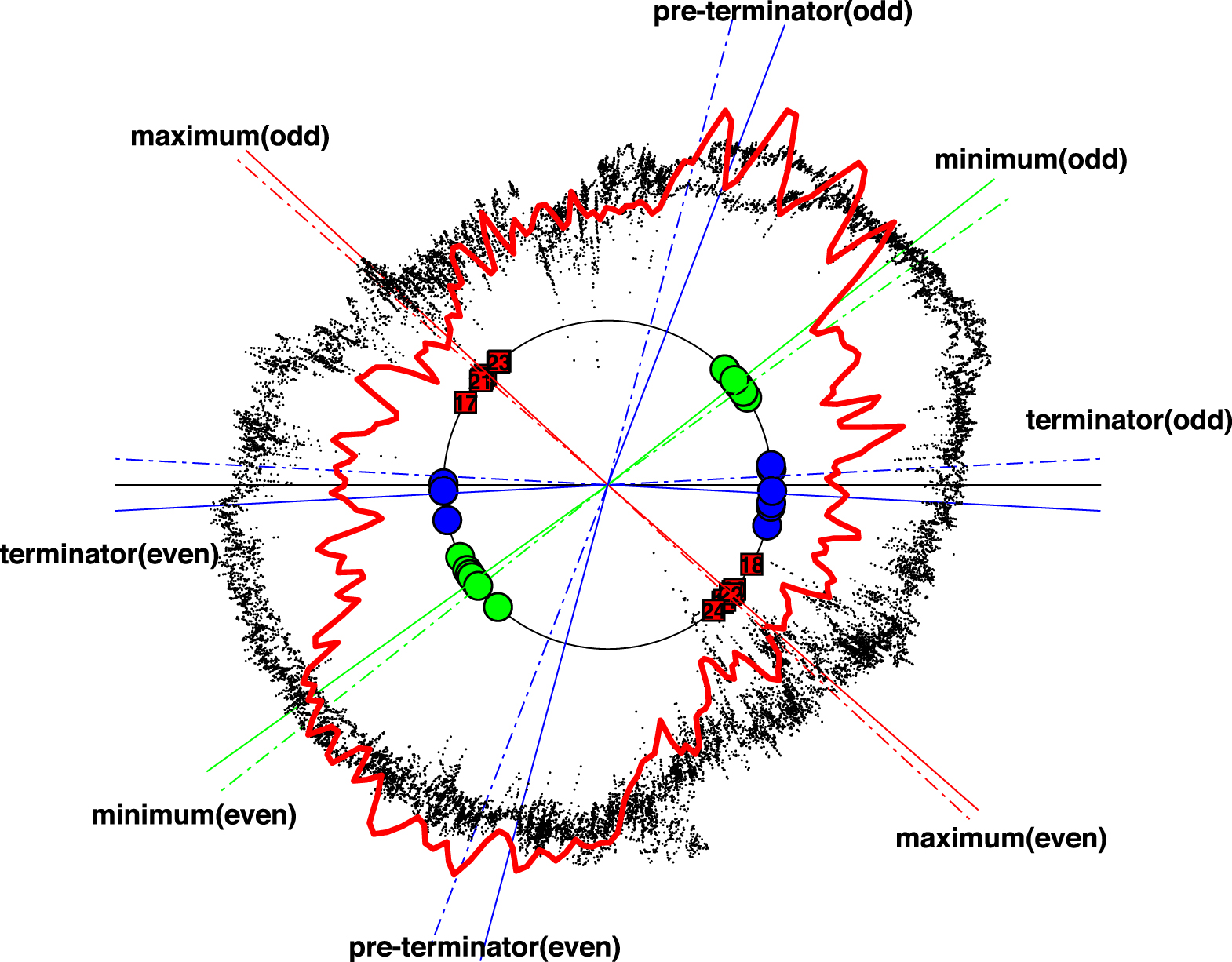 Figure 6. Hale cycle clock constructed such that increasing time (analytic phase) is read clockwise; [0, 2π] in phase on the clock corresponds to the normalized 22 yr Hale cycle (phase [0, 4π] from the Hilbert transform of daily SSN). The analytic phases of the maxima and minima of the last 18 solar cycles are indicated by red squares and green circles respectively and the blue circles indicate terminators for the last 12 solar cycles (McIntosh et al. 2019). Red, green, and blue solid lines indicate the average analytic phases for the maxima, minima, and terminators respectively; these averages are performed separately for odd and even Schwabe cycles. The pre-terminators (blue lines) are at phase 2π/5 (4.4 normalized yr) in advance of the terminator. The solid lines indicating these average phases are continued across the clock with dashed–dotted lines; these indicate that the maxima occur regularly. The horizontal black line is located at the terminator occurrence averaged over all Schwabe cycles. These features form the basis of the Hale cycle clock. Black dots overplot daily F10.7. The red line is the 〈acv(27)〉 obtained by dividing the normalized 22 yr Hale cycle into 12 × 22 month long intervals and averaging the values of acv(27) that fall within each of these intervals across multiple Hale cycles.
