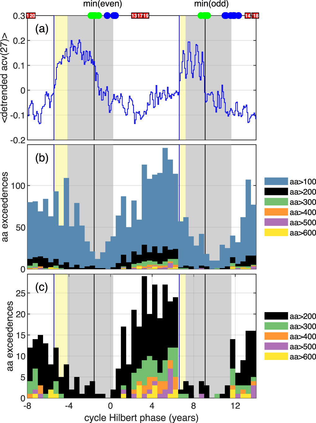 Standard image High-resolution imageFigure 8. Hale cycle clock phase plotted linearly; the normalized 22 yr Hale cycle (phase [0–4π] from the Hilbert transform of daily SSN). The analytic phases of the maxima and minima of the last 18 solar cycles are indicated by red squares and green circles respectively and the blue circles indicate terminators for the last 12 solar cycles (McIntosh et al. 2019). Black lines indicate the average analytic phase for the minima. The quiet interval around minimum, shaded gray, is of 4.4 normalized yr duration starting at the pre-terminator and ending at the average phase of the terminators. These averages are performed separately for odd and even cycles. The late-declining phase (see the text) is shaded yellow. Panel (a): 〈acv(27)〉 (blue trace) is obtained by dividing the normalized 22 yr Hale cycle into 12 × 22 month long intervals and averaging the values of acv(27) that fall within each of these intervals over multiple Hale cycles. Blue vertical lines are at the zero upcrossings; panel (b): six (normalized) month binned counts of days where the maximum daily aa index value exceeded 100, 200, 300, 400, 500, 600 nT; panel (c): counts where the maximum daily aa index value exceeded 200, 300, 400, 500, 600 nT. Zero and 11 normalized yr on this plot correspond to the phase indicated by the black line in Figures 6 and 7.
