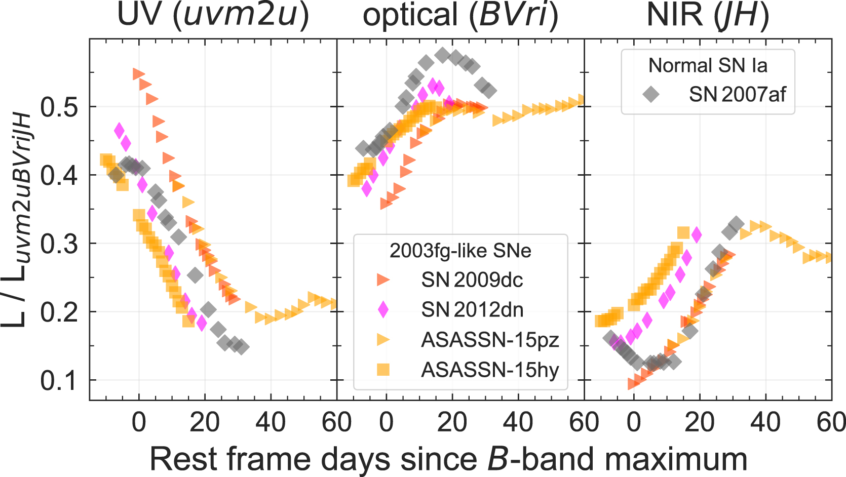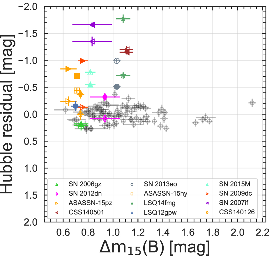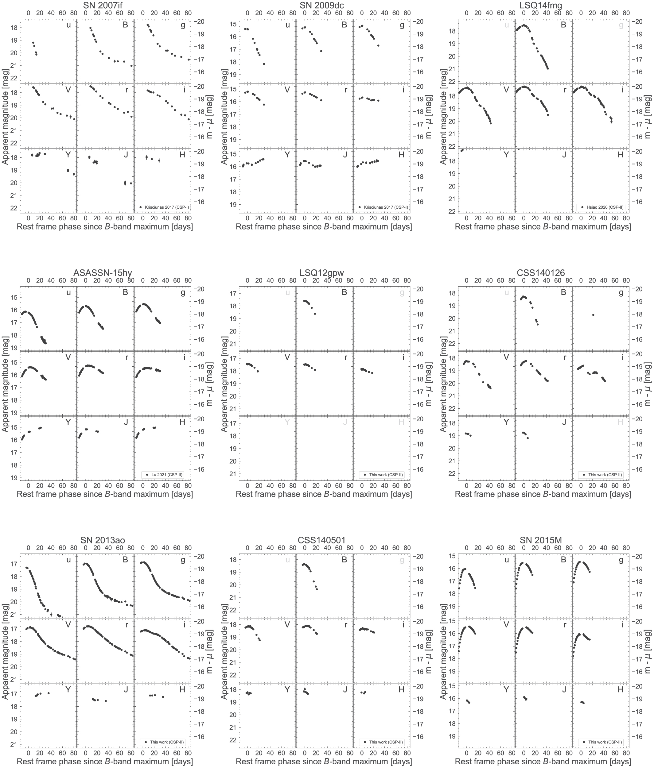 Standard image High-resolution imageData from five 2003fg-like SNe that have been published by other groups (SN 2003fg: Howell et al. 2006; SN 2006gz: Hicken et al. 2007; SN 2009dc: Yamanaka et al. 2009, 2016; Tanaka et al. 2010; Silverman et al. 2011; Taubenberger et al. 2011; SN 2012dn: Chakradhari et al. 2014; Parrent et al. 2016; Taubenberger et al. 2019; ASASSN-15pz: Chen et al. 2019) are also included in the sample. In the BVgri bands, where possible, S-corrections were applied to transform the photometry to the CSP natural system. Swift Ultraviolet/Optical Telescope data of SN 2015M were also obtained from the SN archive (Brown et al. 2014a) via the Swift Supernovae website. 30